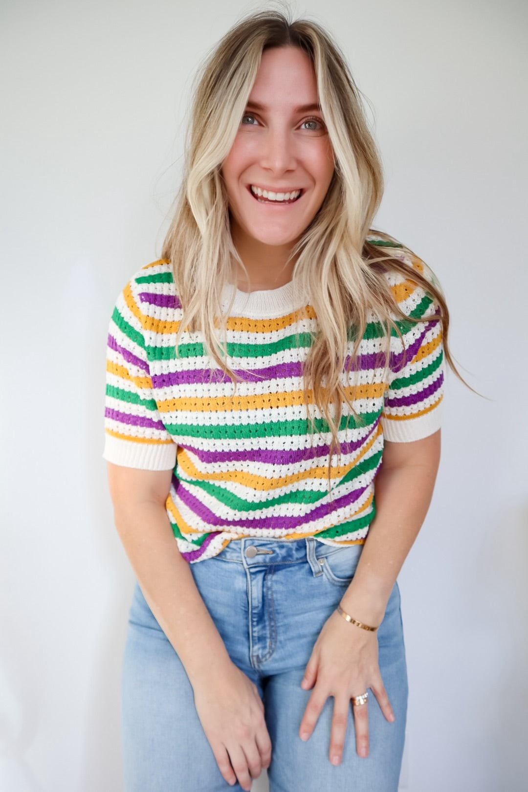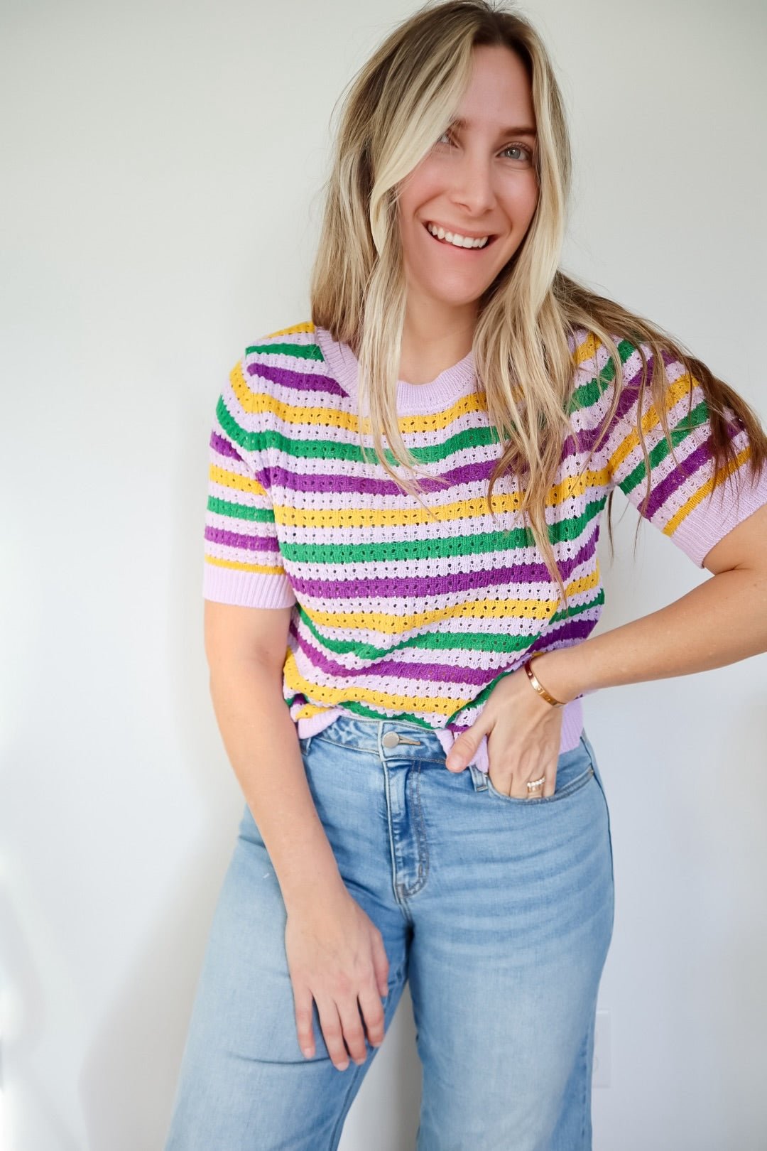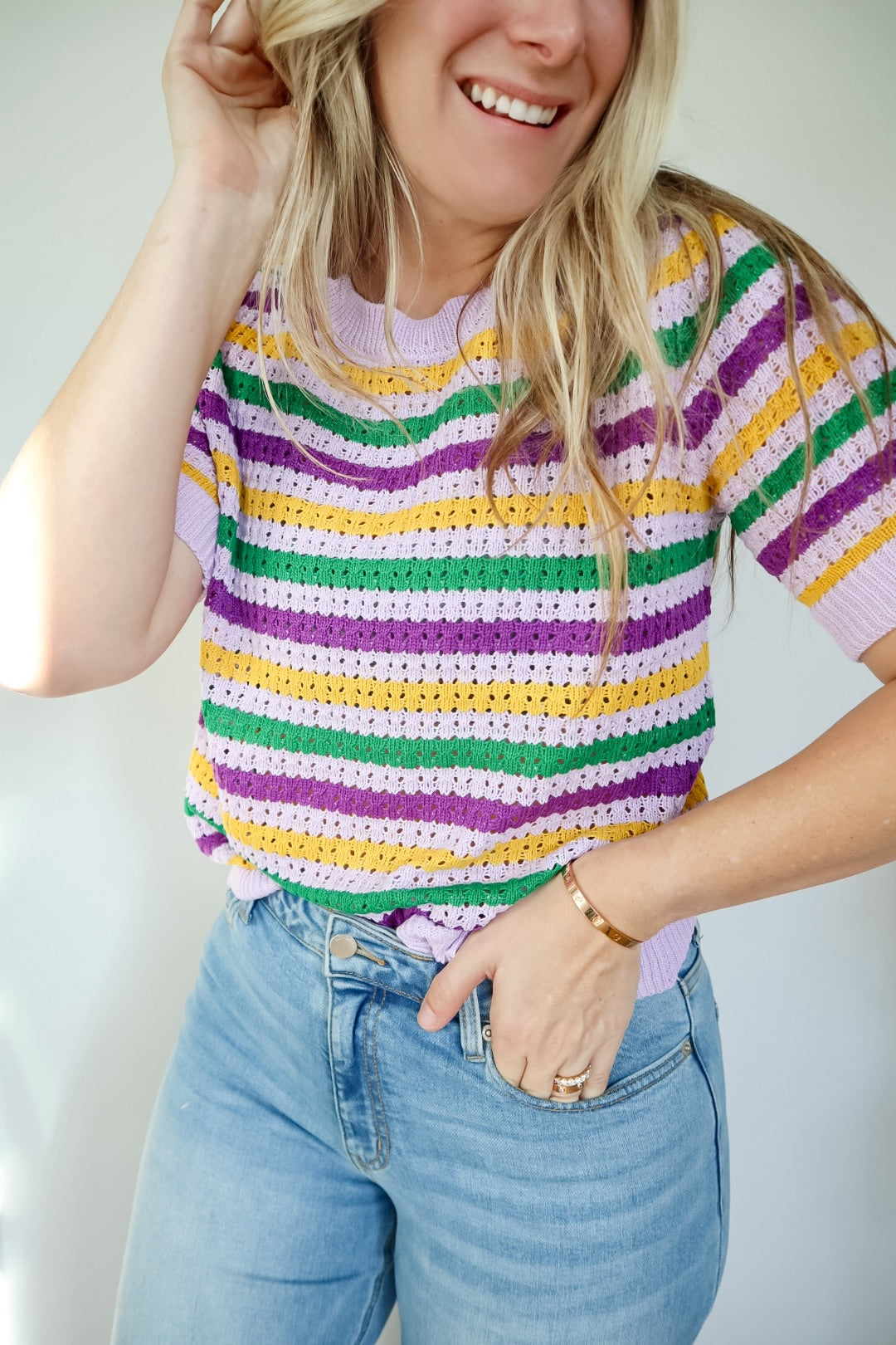 Mardi Gras Loose Knit Stripe Short Sleeve Top