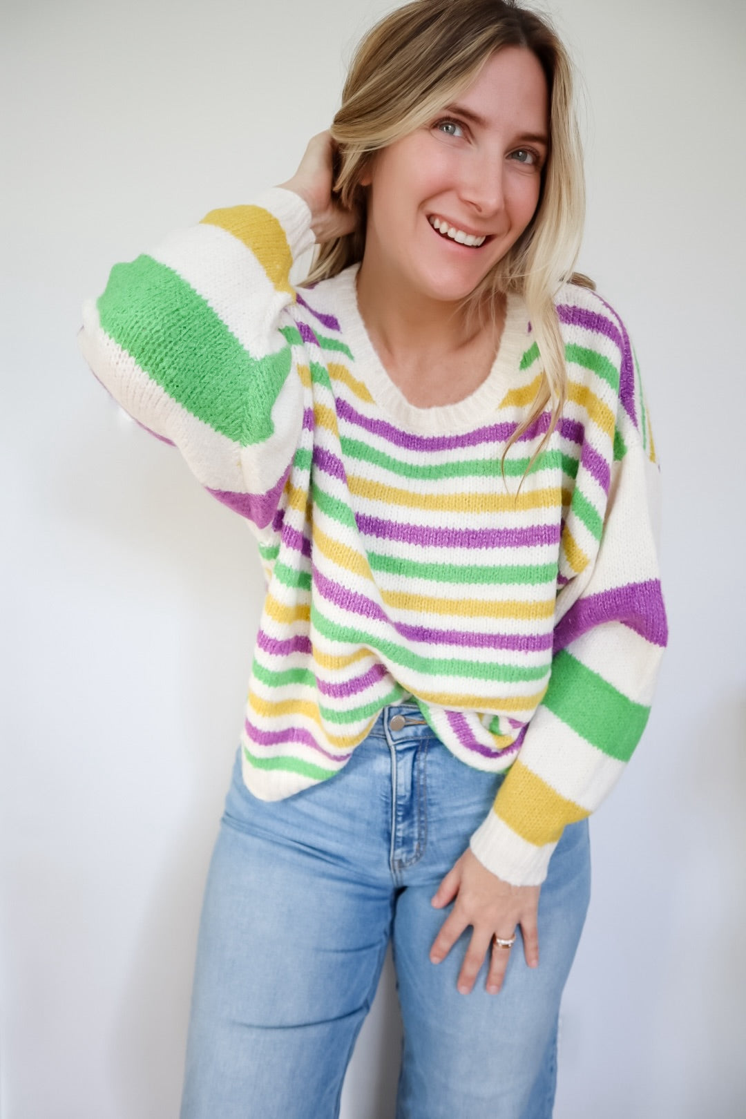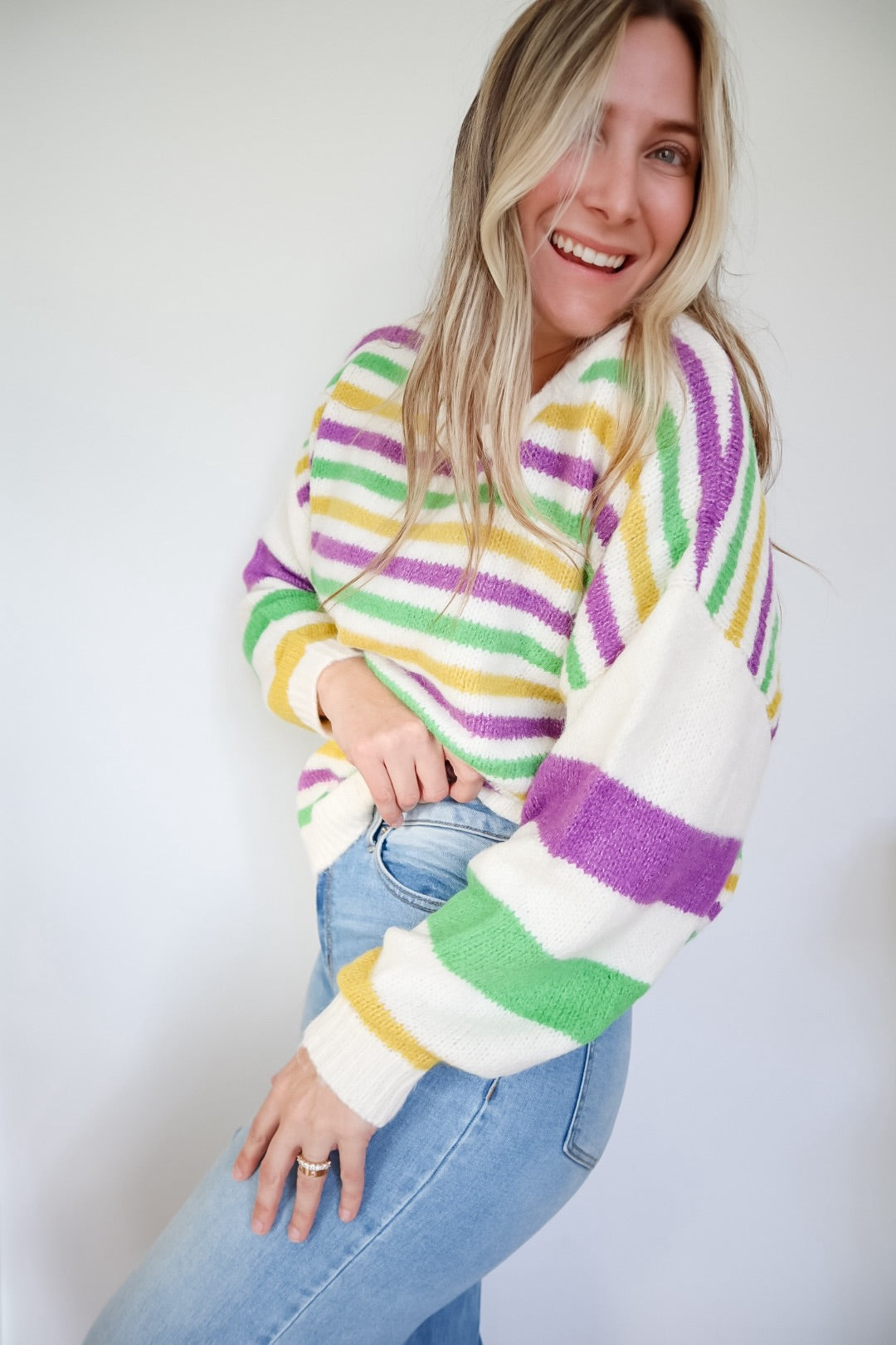 Mardi Gras Crewneck Ivory Stripe Sweater Top