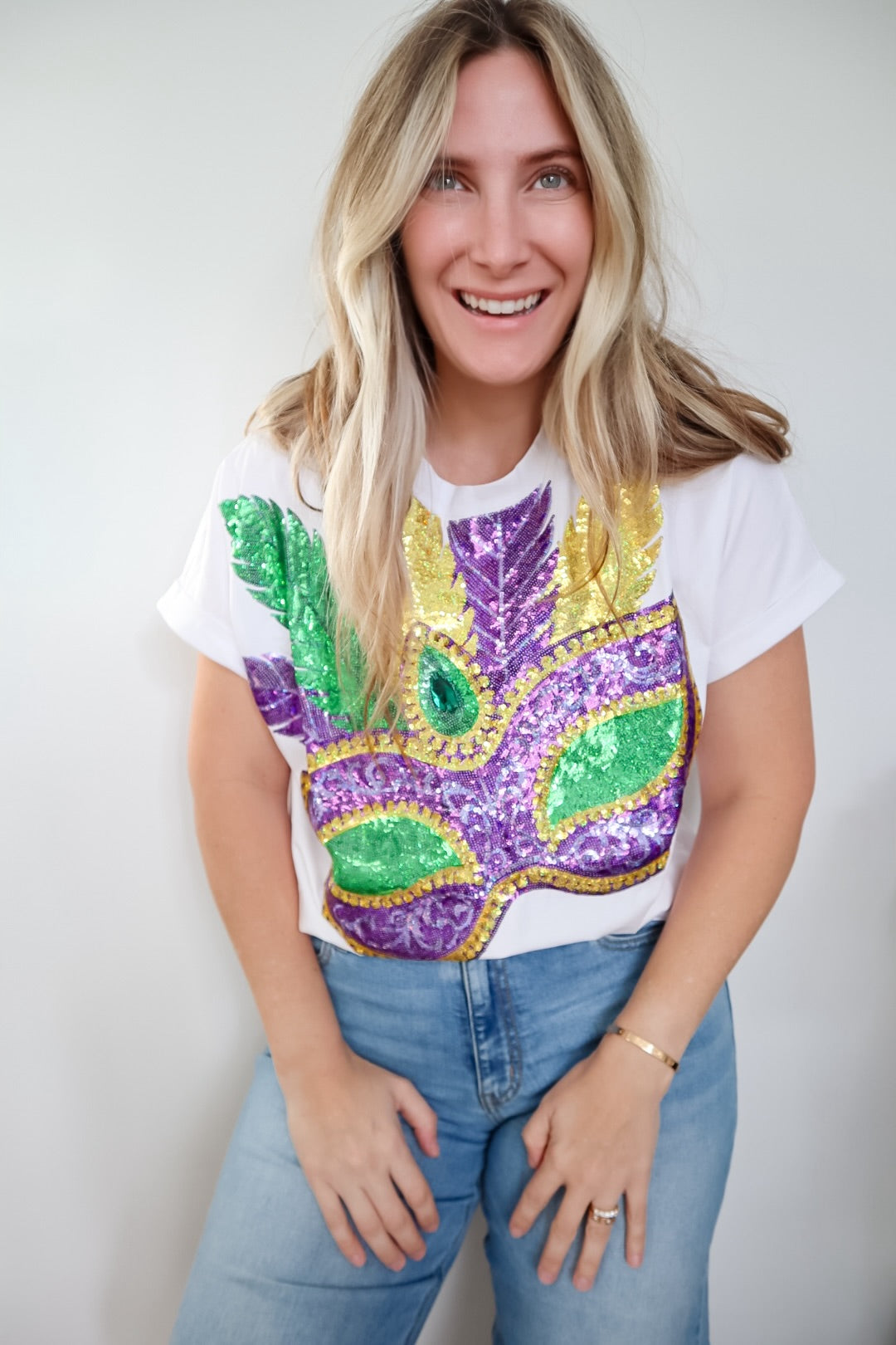 Mardi Gras Mask Sequin Cuff Sleeve Tee
