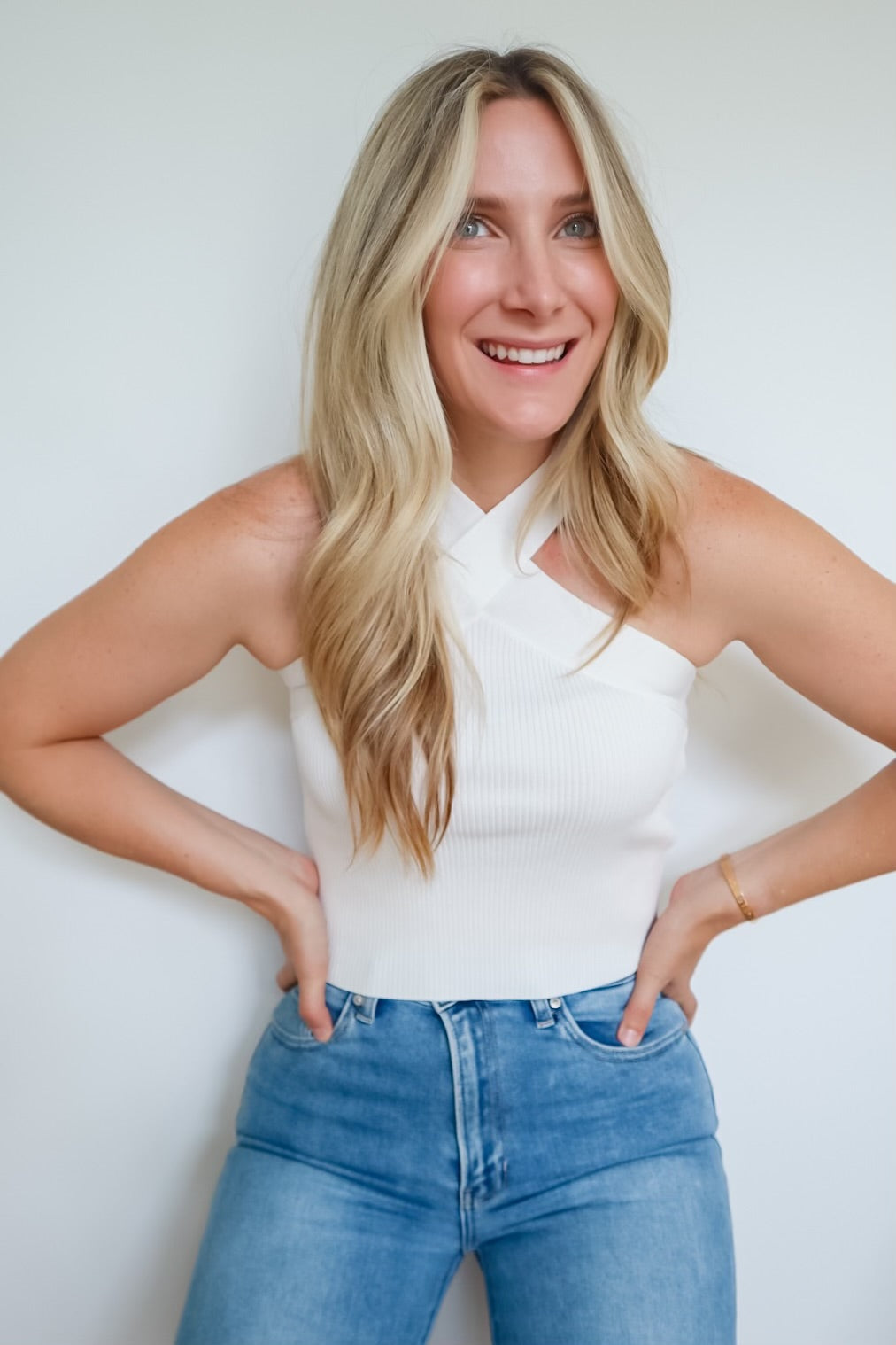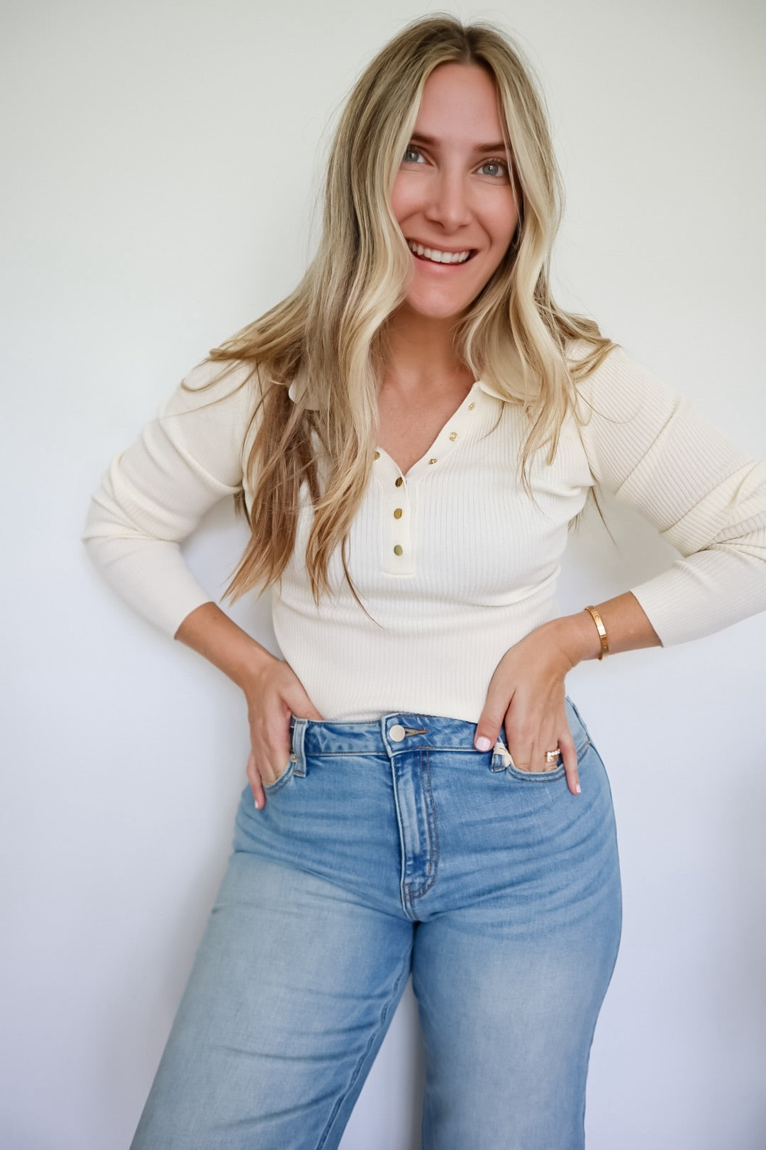 Tamara Collared Gold Snap Button Cream Long Sleeve Knit Top
