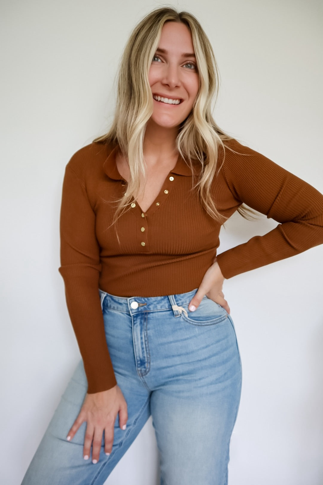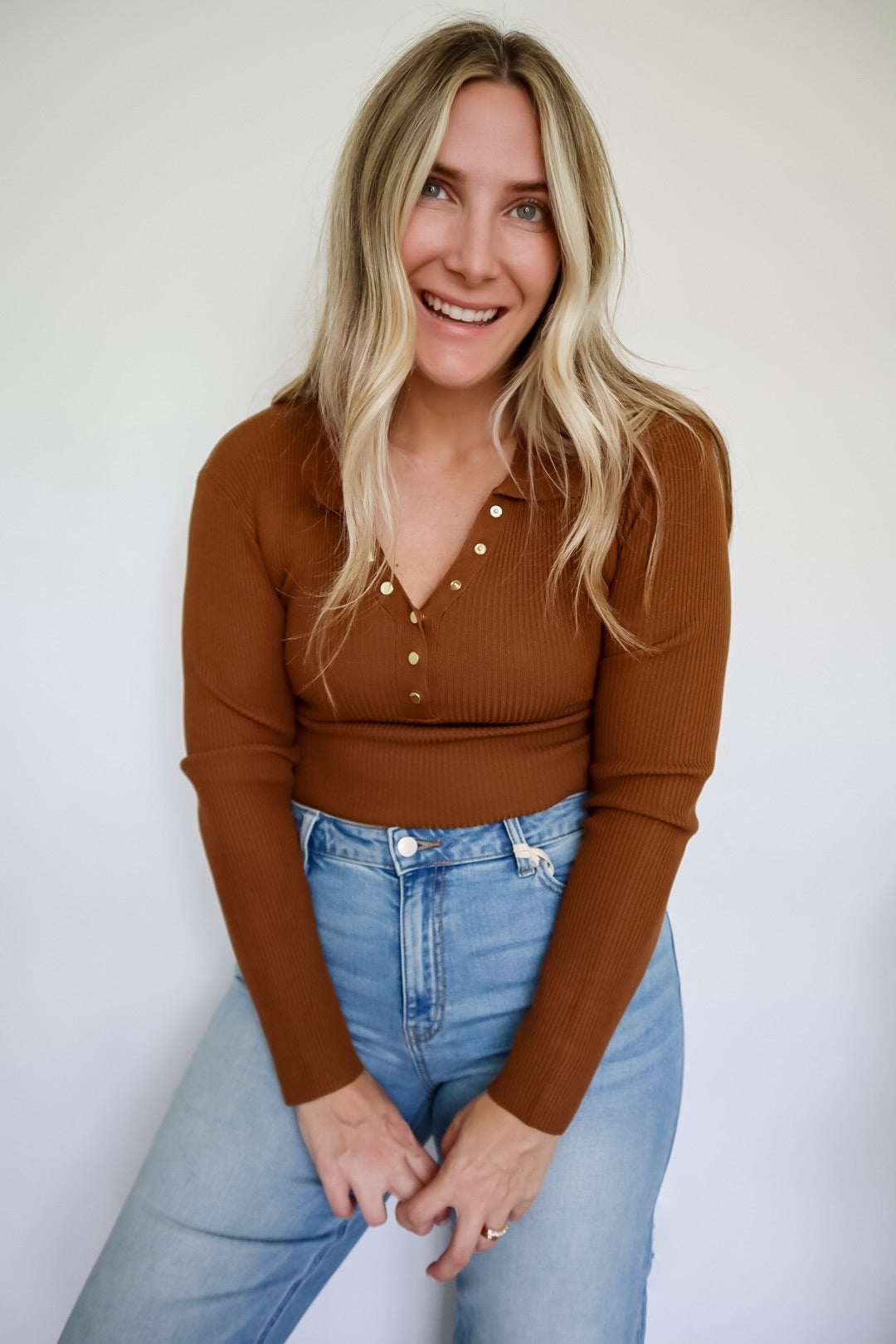 Tamara Collared Gold Snap Button Brown Long Sleeve Knit Top