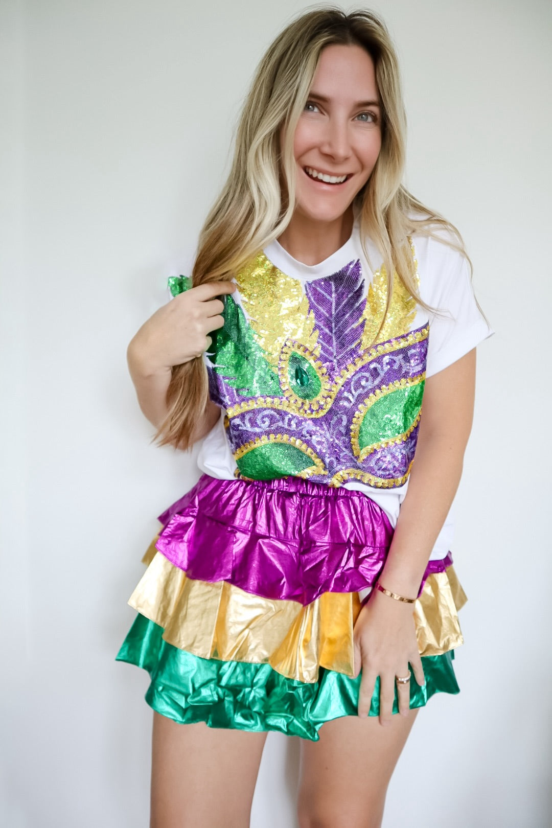 Elevate your Mardi Gras celebration with this striking color block metallic tiered skirt. Featuring bold jewel tones and shimmering metallic accents, the dynamic layered design creates movement and dimension with every step. The expertly crafted color blocking delivers maximum visual impact, while the tiered silhouette offers flattering coverage and comfortable wear. Perfect for parades, parties, and festive gatherings, this skirt combines sophisticated style with celebratory flair. Make a statement in a piece that captures the vibrant spirit of the season.