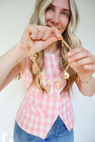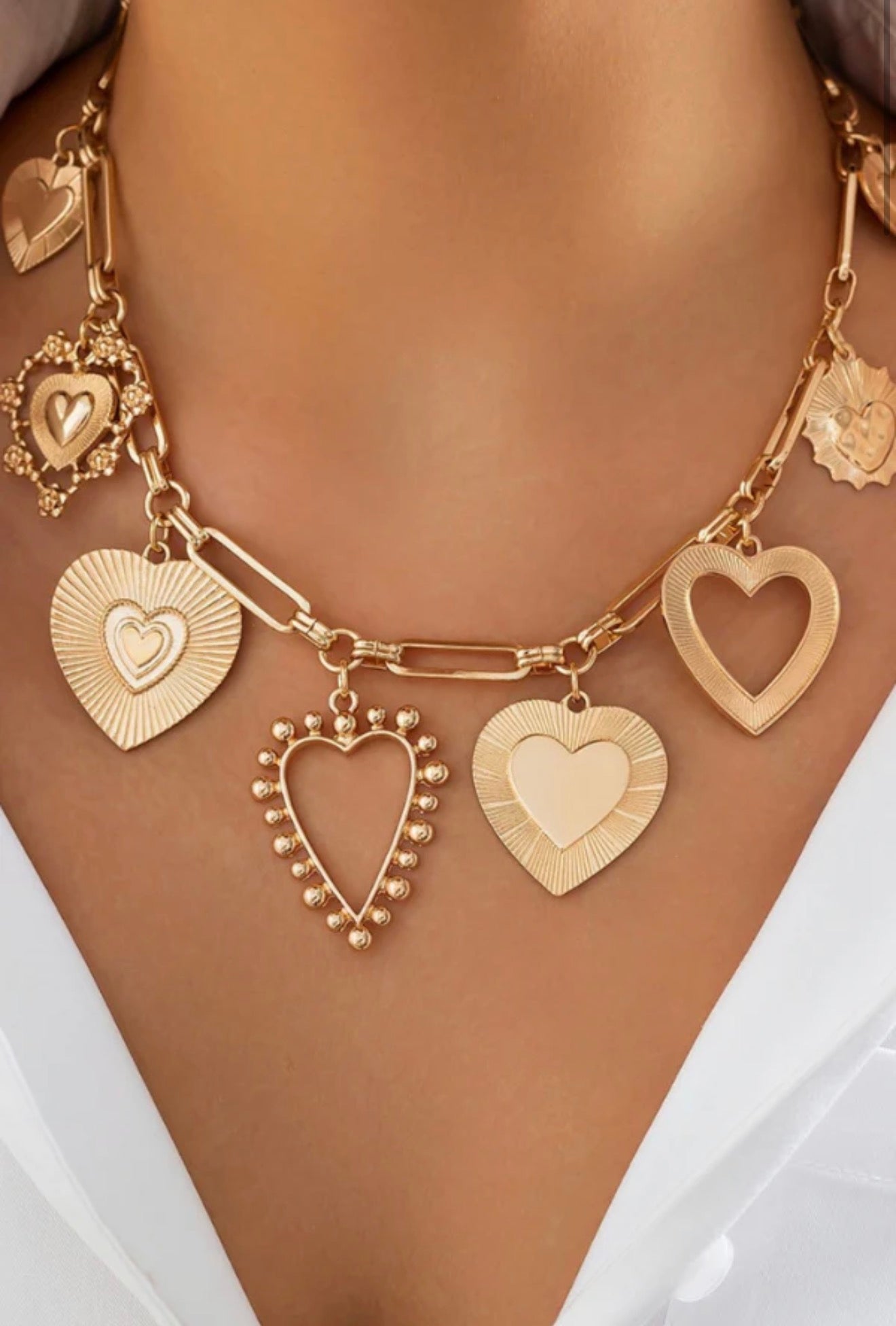 Illuminate your style with the Casey Gold Heart Charm Necklace! This captivating piece features a stunning array of heart-shaped pendants, each with unique textures that radiate warmth and personality. The bold chain links make it a versatile choice for layering or standing out on its own.