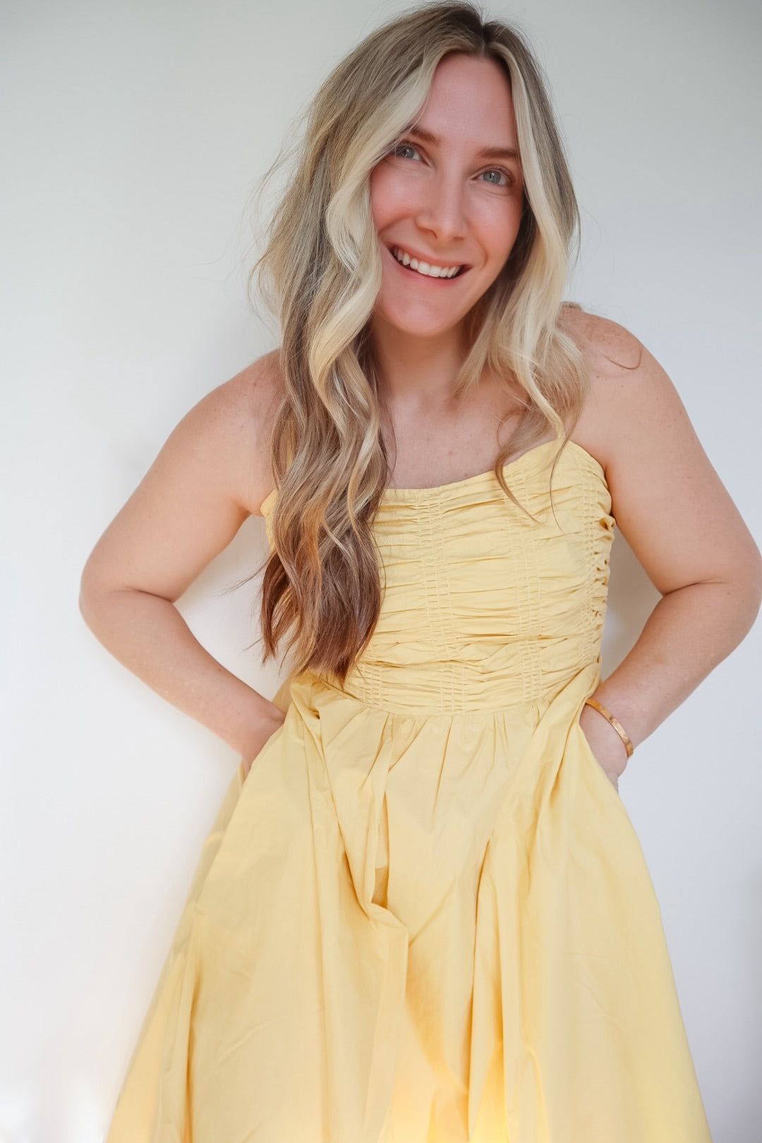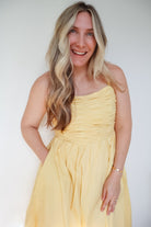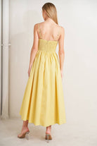 Radiate effortless elegance in this sun-kissed yellow midi dress featuring a figure-flattering smocked bodice and breezy full skirt. Designed with a chic straight neckline and dainty straps, it is your go-to woven sundress for timeless summer style.