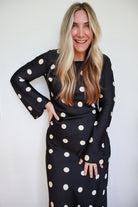 The Georgie Polka Dot Black Midi Dress offers a refined blend of classic charm and modern sophistication. Its bias-cut design ensures a sleek, flattering silhouette that gracefully contours the body. Featuring an allover polka dot pattern, this dress brings a playful yet timeless vibe. The long sleeves and high neckline provide a polished, contemporary finish, while the invisible side zipper maintains a smooth look. Ideal for elegant occasions, it combines comfort with style effortlessly.