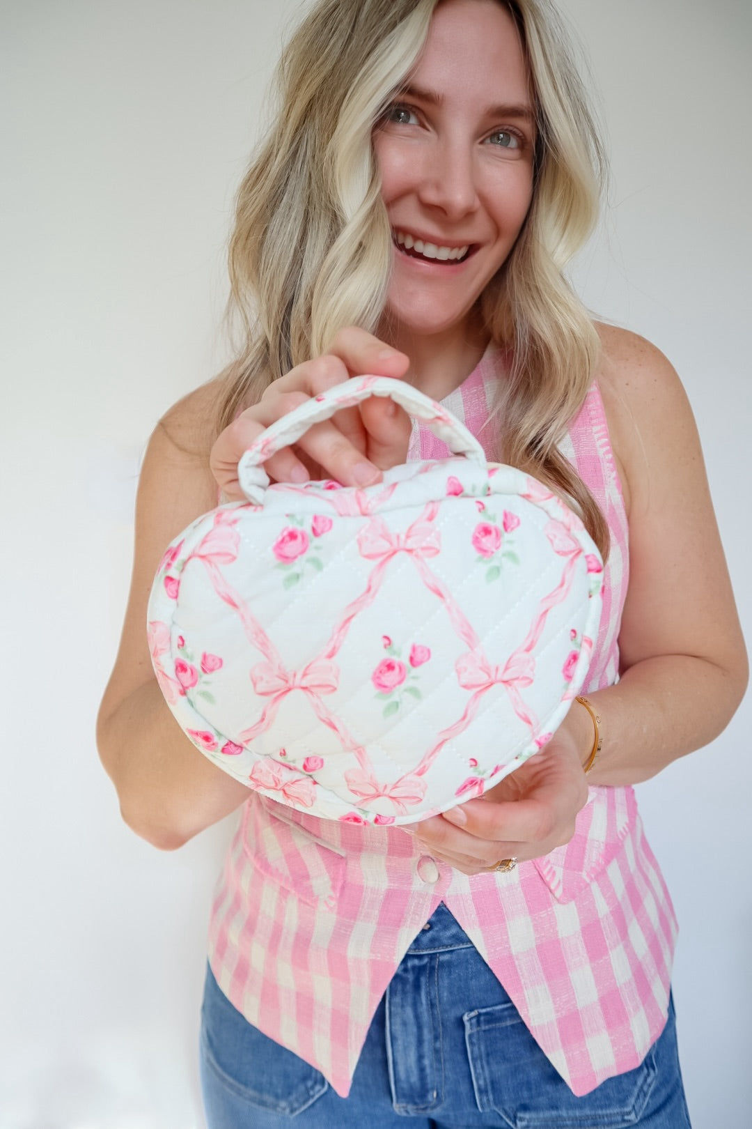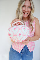 Elevate your organization with the Gianna Pink Ribbon Bow Floral Heart Shaped Bag! Its charming quilted design and vintage floral patterns make every use feel special. Lightweight and spacious, this delightful bag is perfect for makeup or travel essentials. Carry it effortlessly or showcase it on your vanity—style meets function!