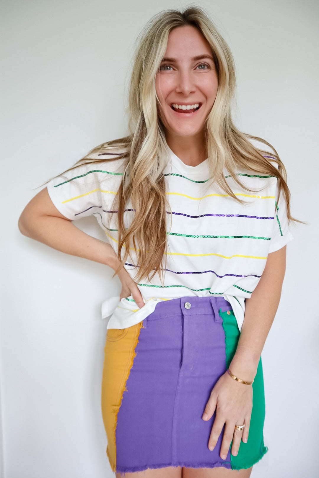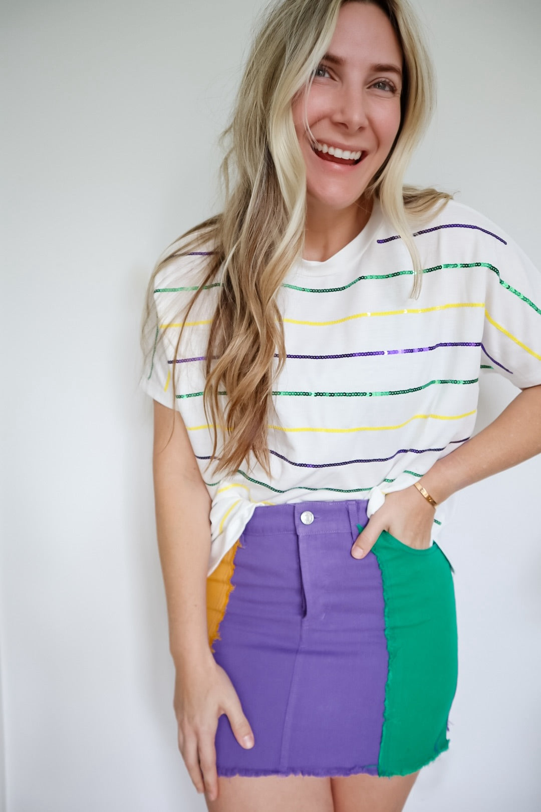 This mini skirt is perfect for adding a touch of fun and festivity to any outfit. With a comfortable, stretchy fabric, it's perfect for all-day wear. Its color block design adds a playful touch to any look.