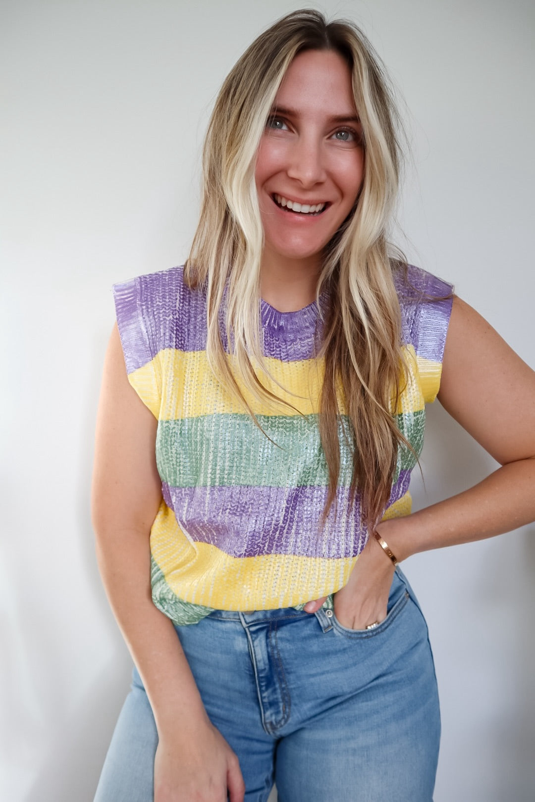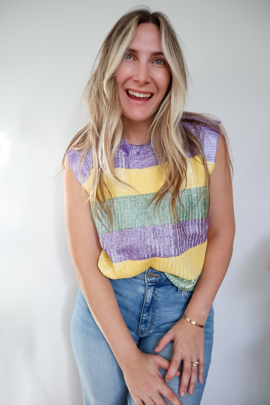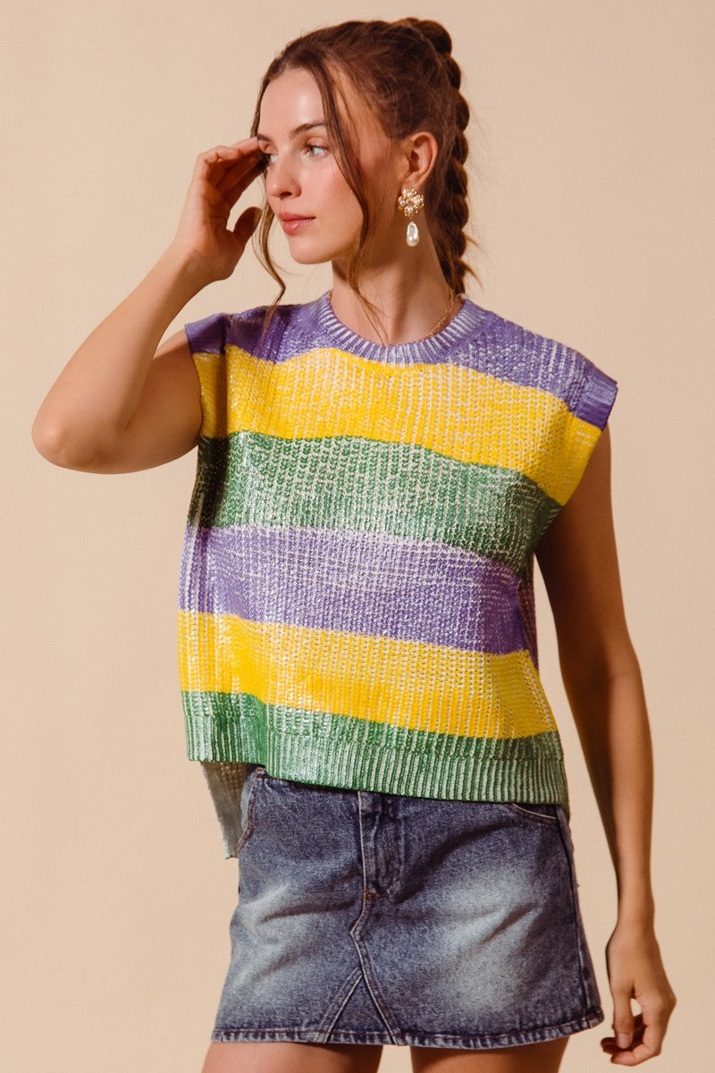 Mardi Gras Metallic Stripe Sweater Vest Top