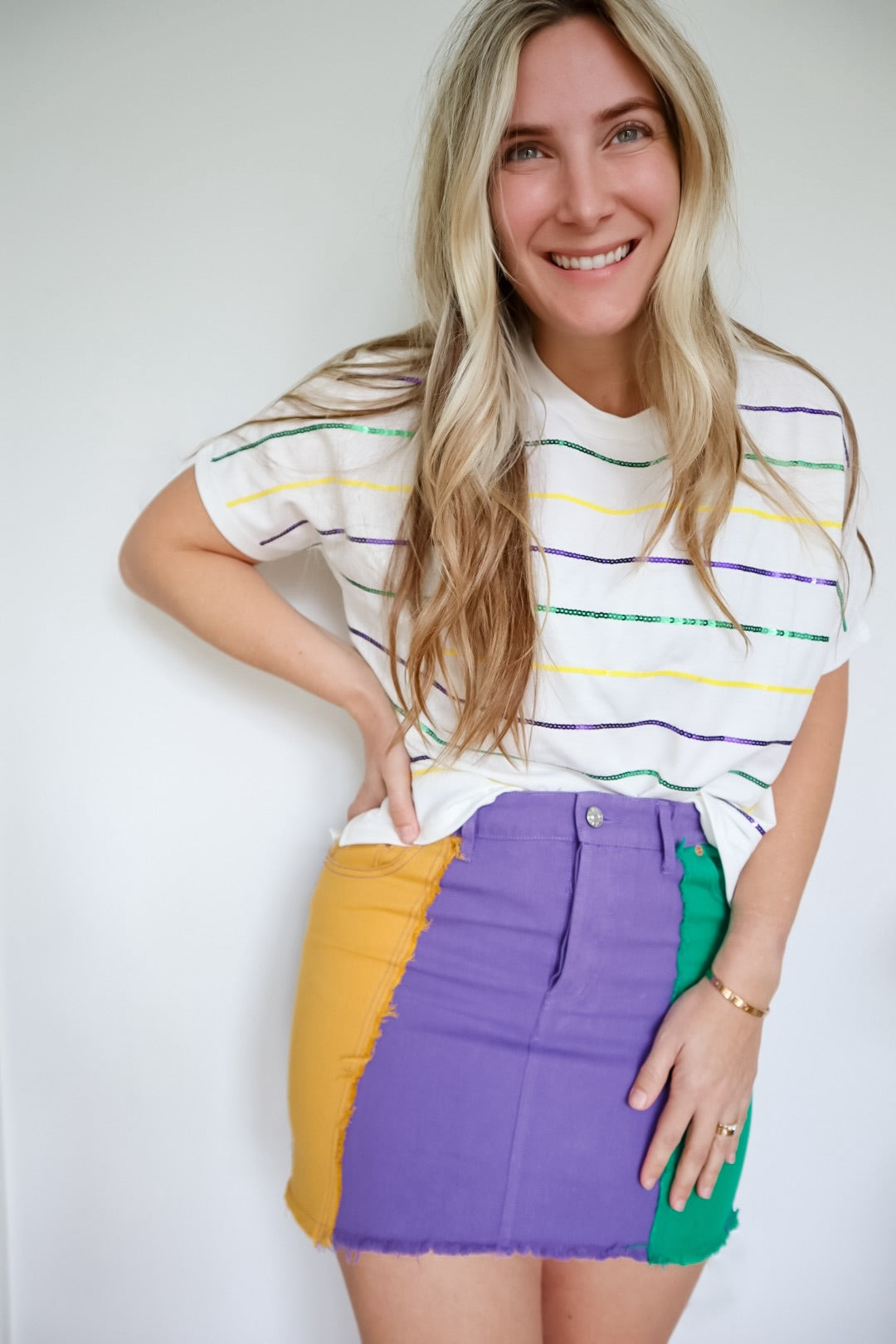 Upgrade your wardrobe with our Mardi Gras Sequin Stripe Dolman Sleeve Tee. Made for comfort, this top is constructed with high-quality materials and features a festive sequin stripe design. Perfect for any celebration, you'll be sure to have fun in style.
