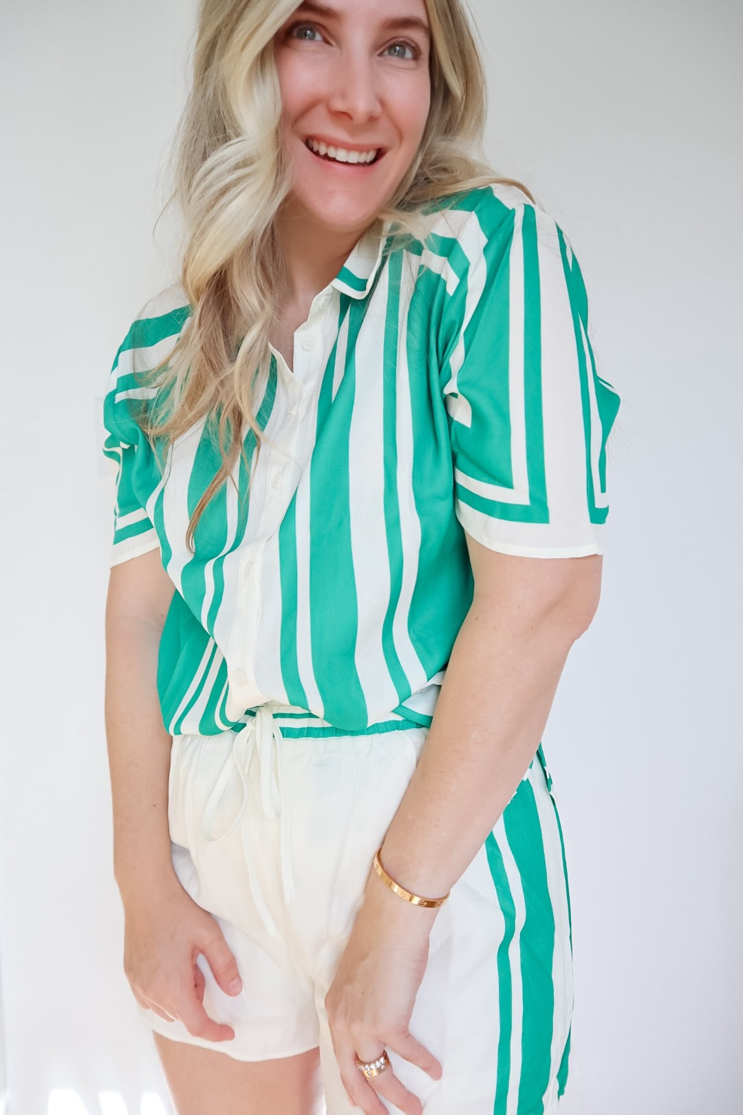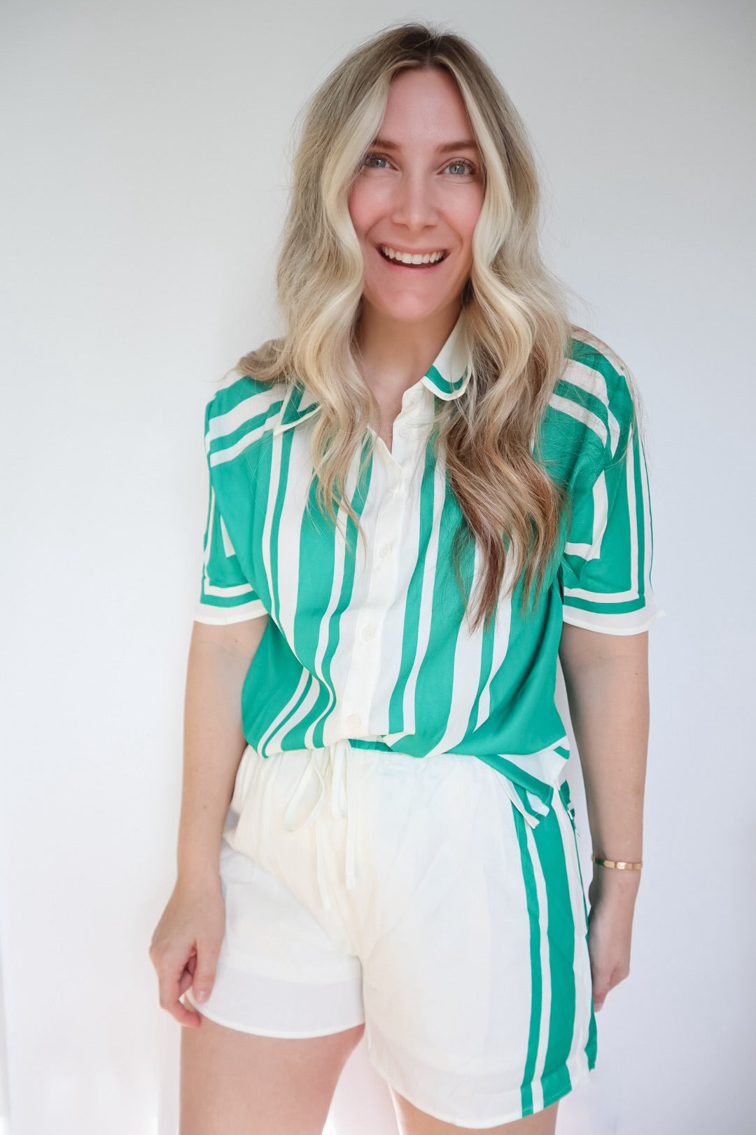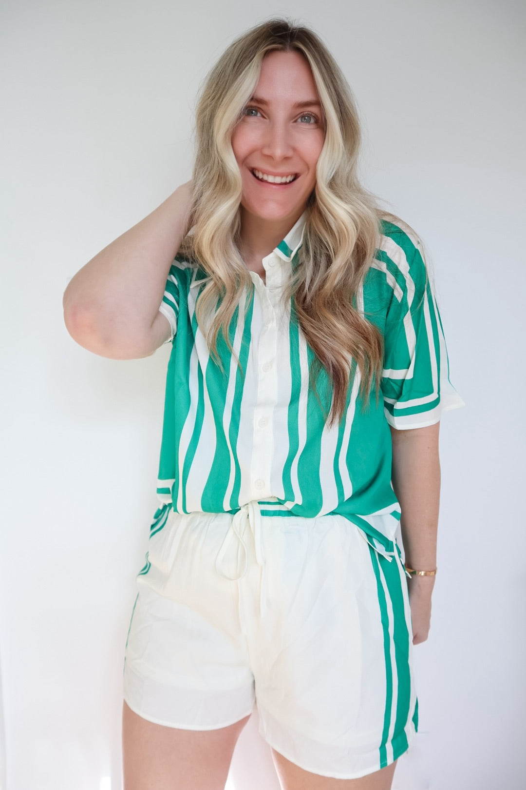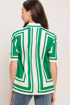 Crush your vacation style with this vibrant green geometric two-piece set. Featuring a breezy button-down blouse and matching drawstring shorts, it’s the ultimate effortless outfit for summer trips and sun-soaked brunch dates.