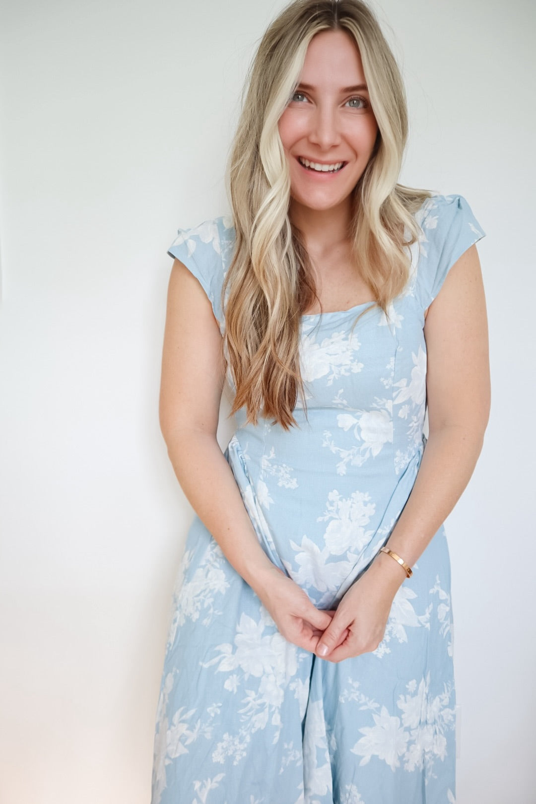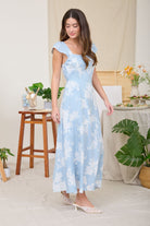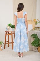 Embrace effortless elegance in this stunning floral midi dress, featuring romantic bell sleeves and a classic square neckline. Designed with strategic side ruching and back smocking, it provides a figure-flattering, custom fit for any special occasion.