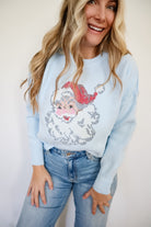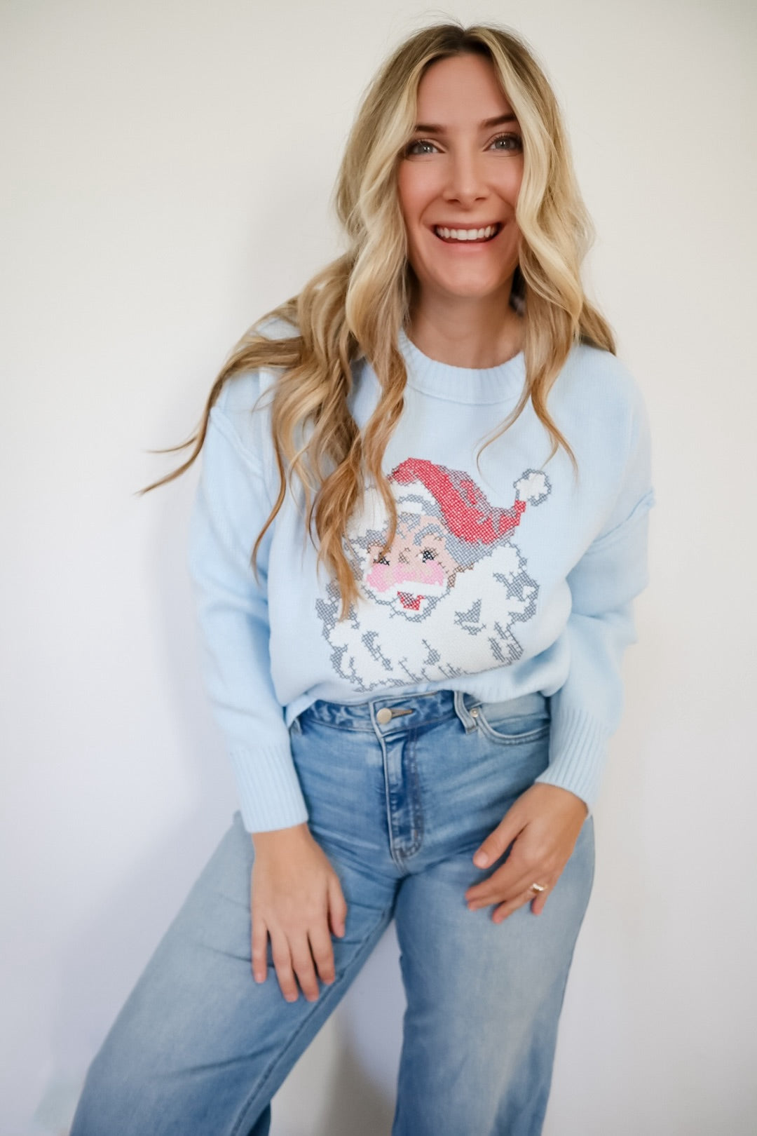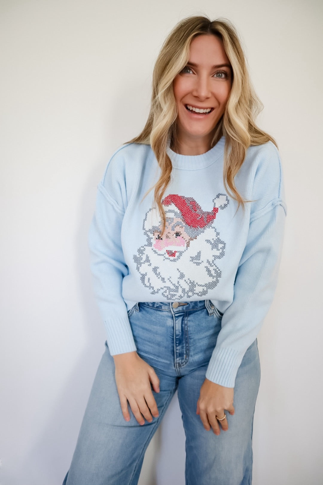 Santa Embroidery Stitch Detail Blue Sweater Top