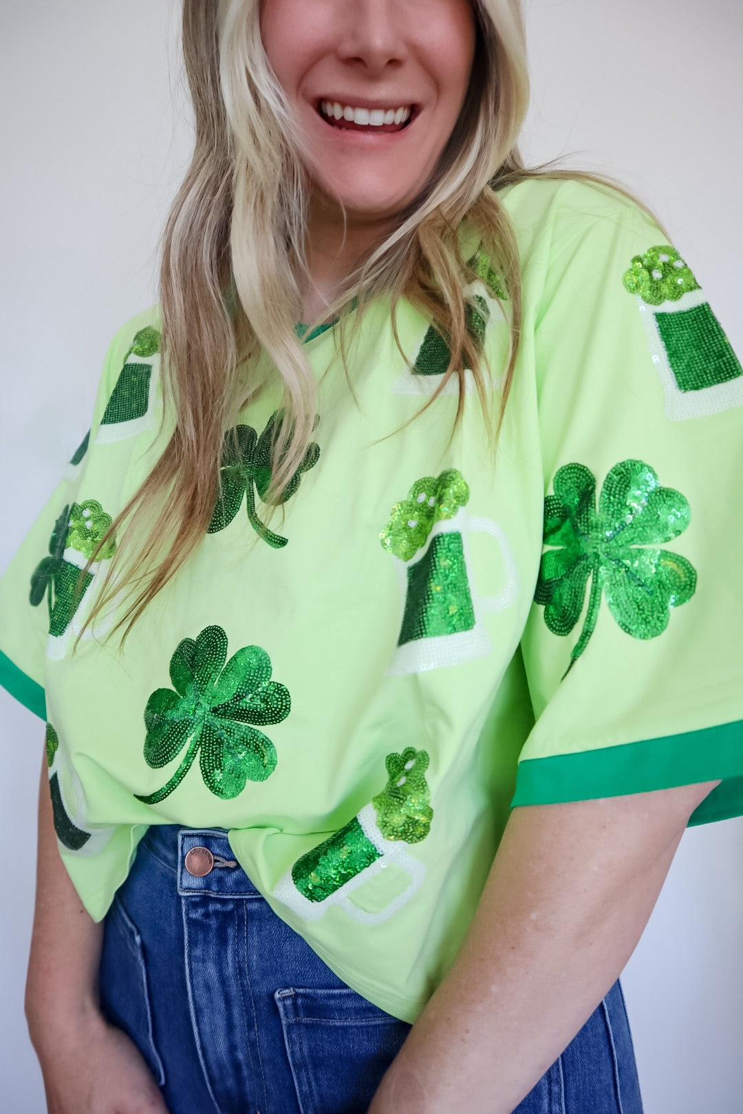 Celebrate your love for St. Patrick's Day with the Scattered St. Patty Shamrock Brew Sequin Design Oversized Tee! This fun and festive tee combines quality craftsmanship with a dazzling shamrock design, ensuring you stand out in style. Embrace the spirit of celebration and let your outfit shine with joy!