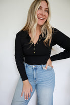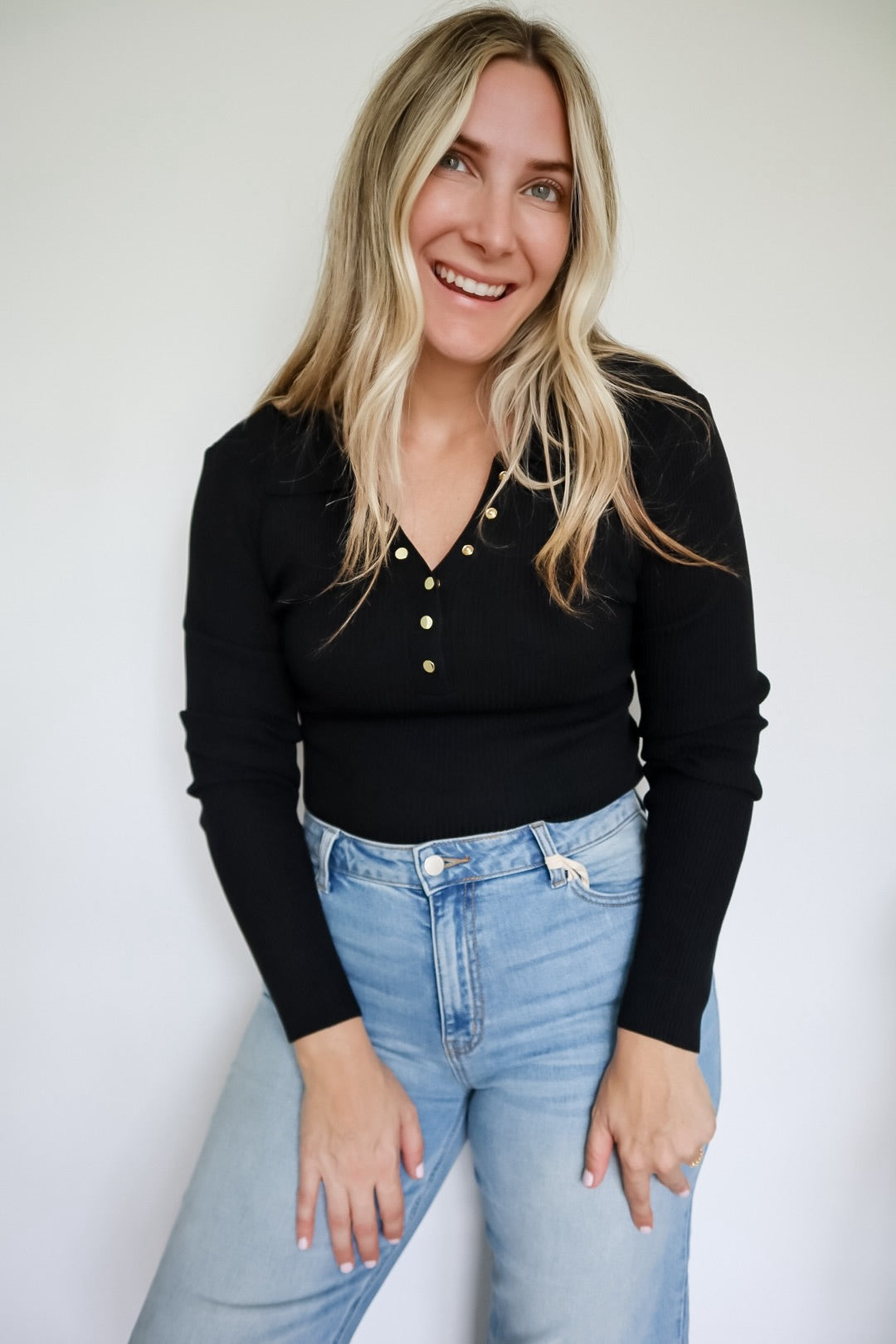 Tamara Collared Gold Snap Button Black Long Sleeve Knit Top