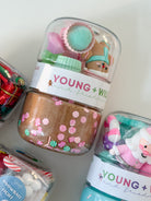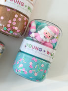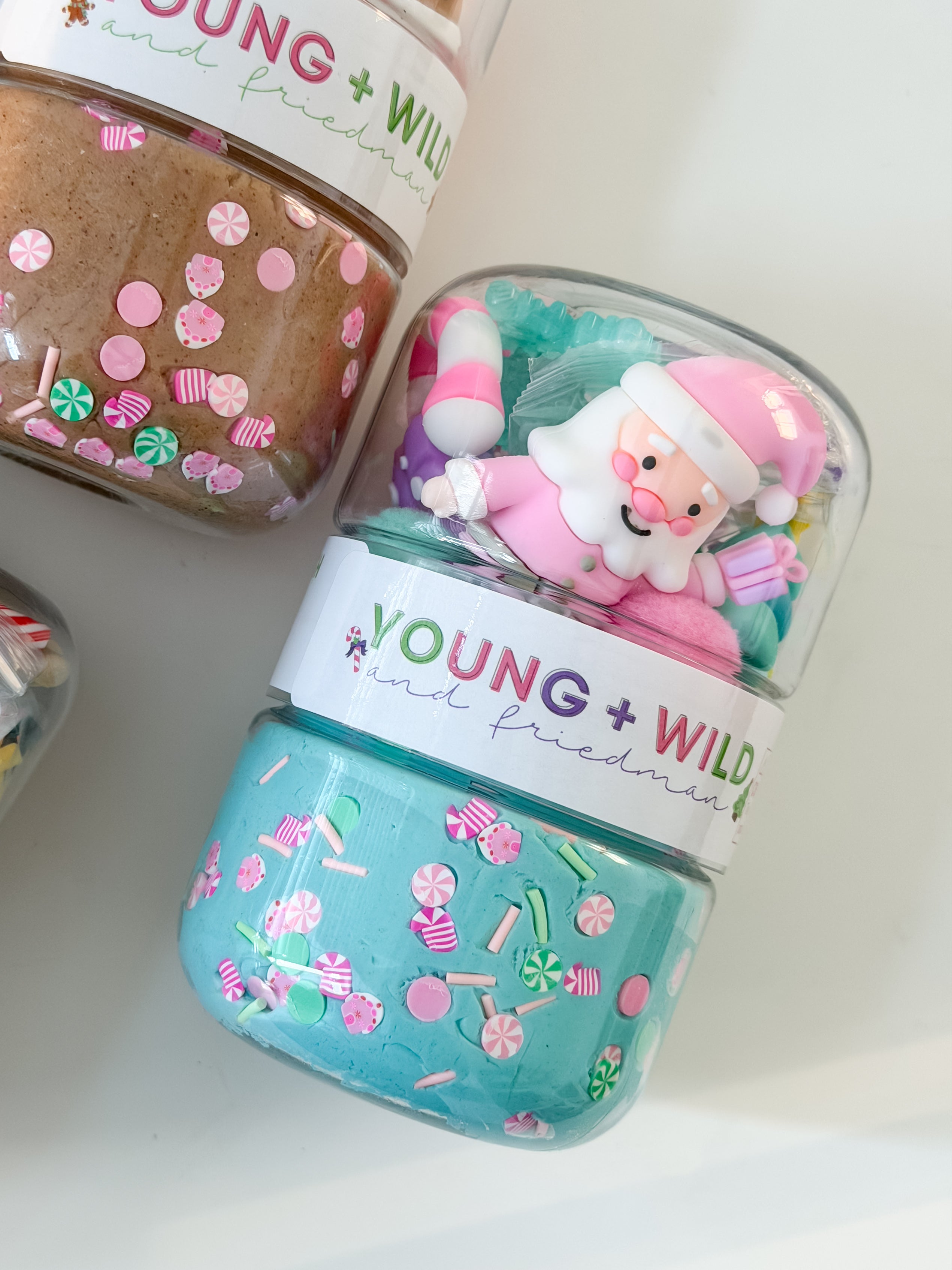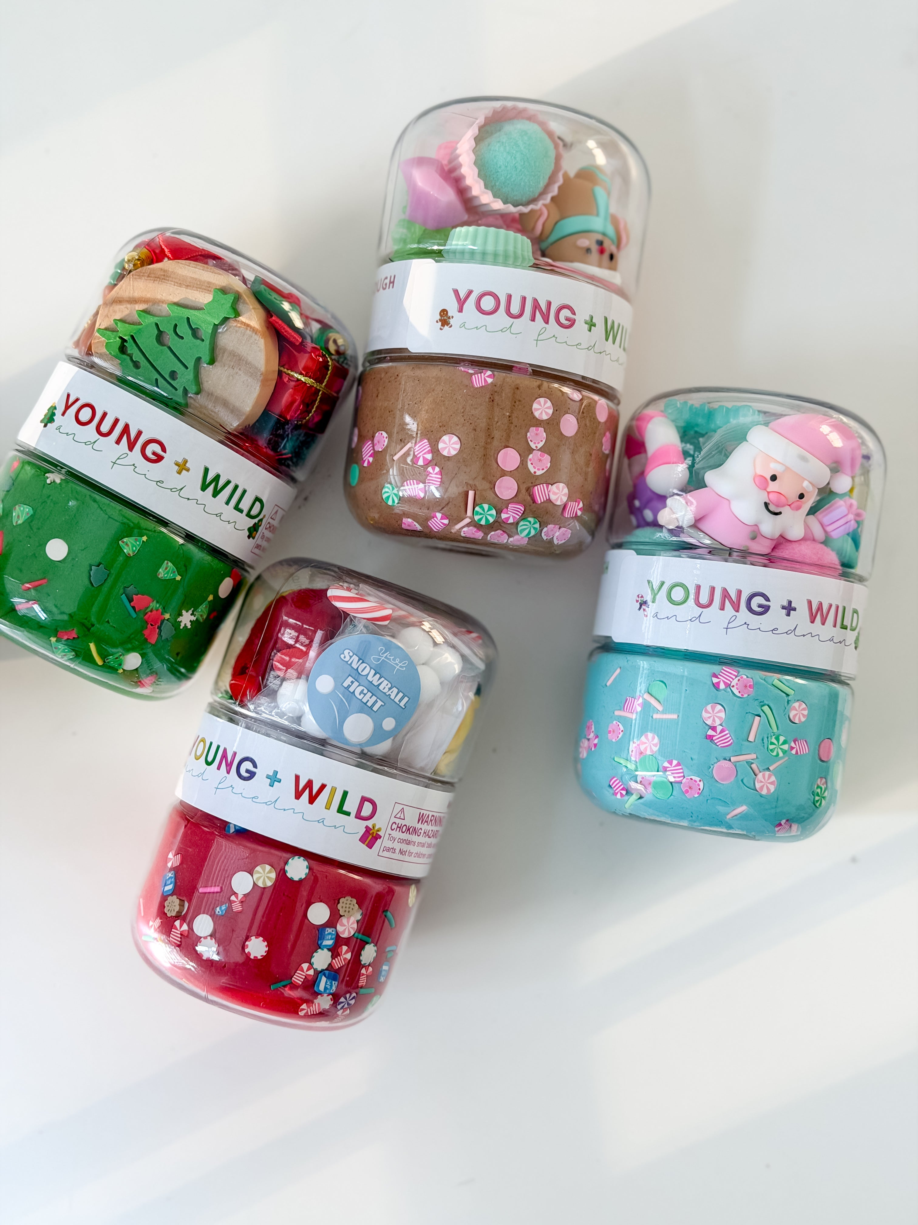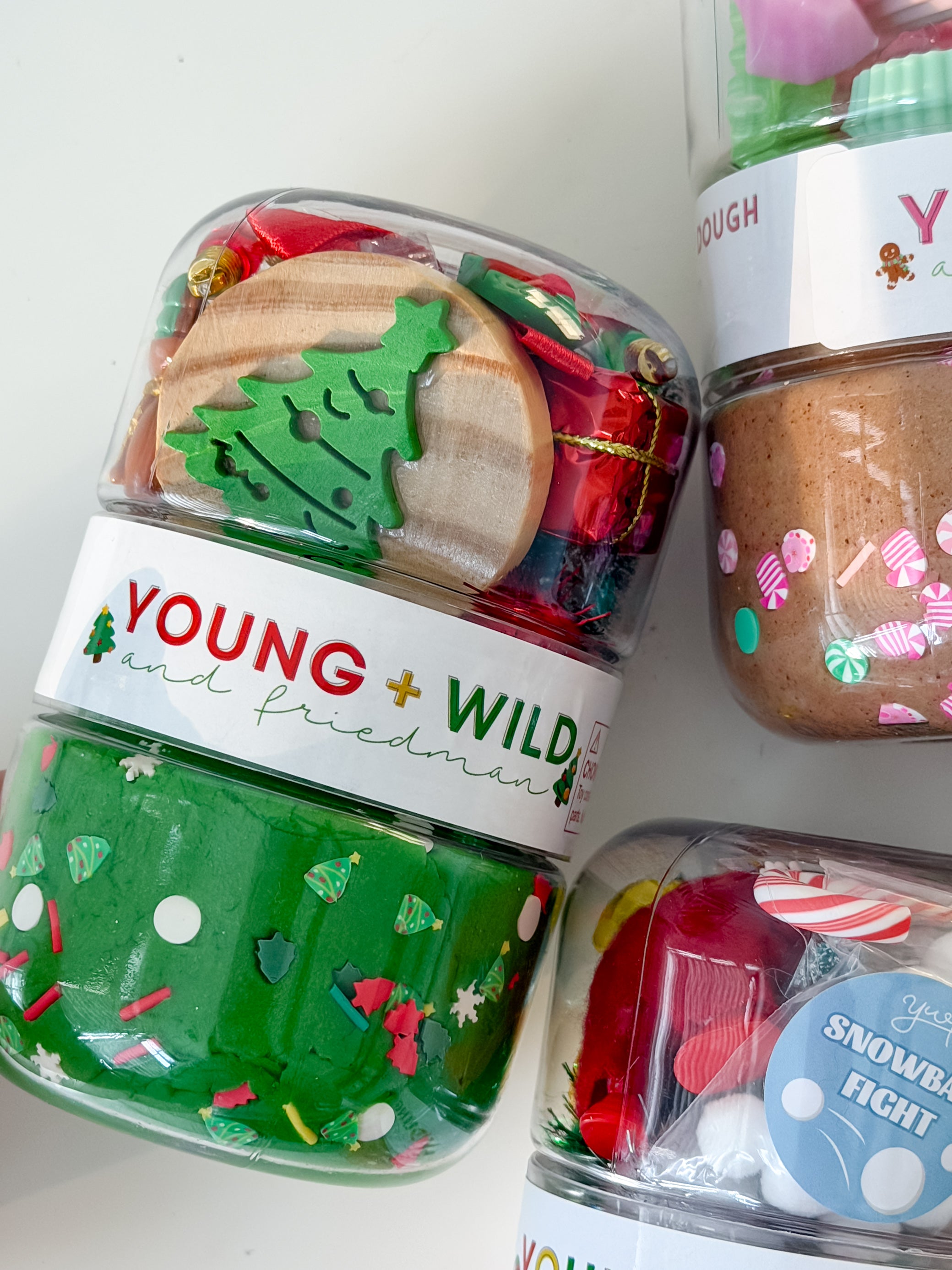 The Young + Wild and Friedman Holiday Grab & Go Dough Jars feature one side filled with signature homemade sensory dough and the other packed with themed trinkets for endless imaginative play. Perfect for stockings, party favors, or on-the-go fun!