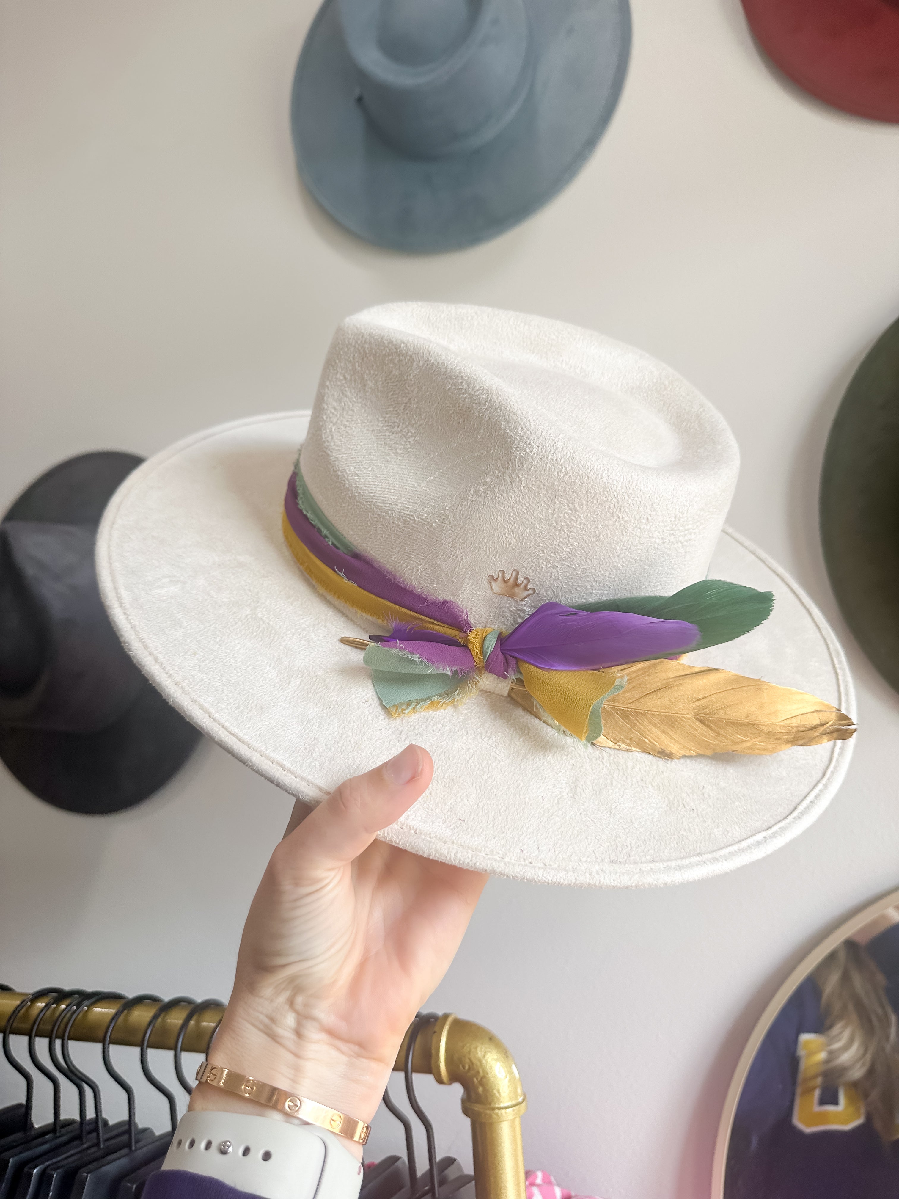 Celebrate Mardi Gras in style with our festive custom hat. Perfect for adding a touch of flair to any outfit, this hat is sure to make a statement. *No further customizations on this one. Sold as designed.