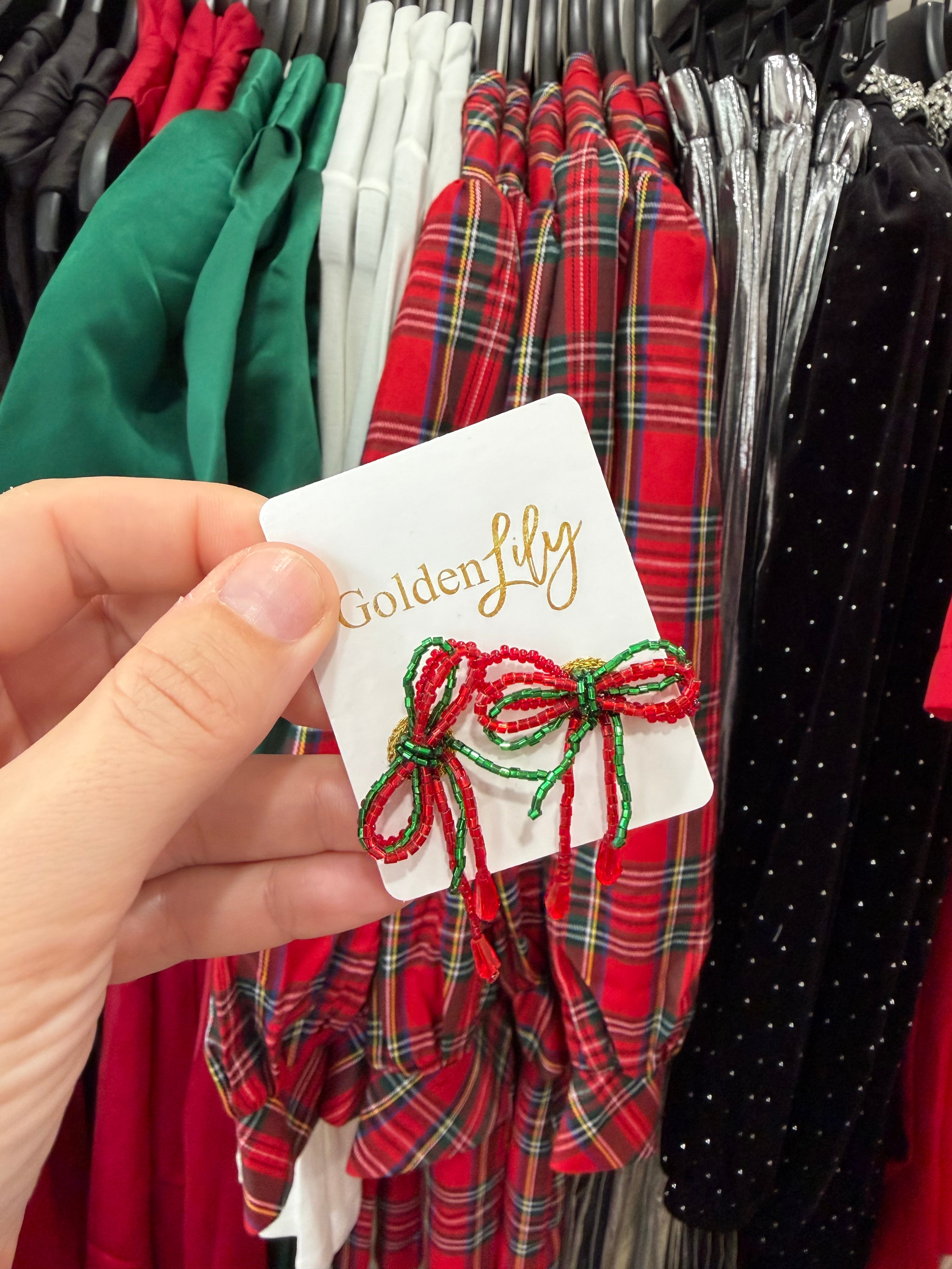 Add a festive touch to your holiday look with Golden Lily Christmas Mini Bow Earrings. Adorned with delicate hand-beaded bows in vibrant red and green, they add a subtle sparkle to your outfit. At 1.5 inches, these lightweight earrings are comfortable to wear and complement both casual and dressy ensembles. Nickel-free and crafted with attention to detail, they are a cheerful and elegant accessory for the holiday season.