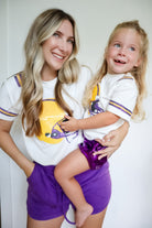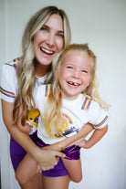 This Game Day Purple & Gold Kid’s Helmet Sequin Tee is perfect for matching with mommy while showing your team spirit for LSU. The comfortable fit and high-quality material make it a must-have for young fans.