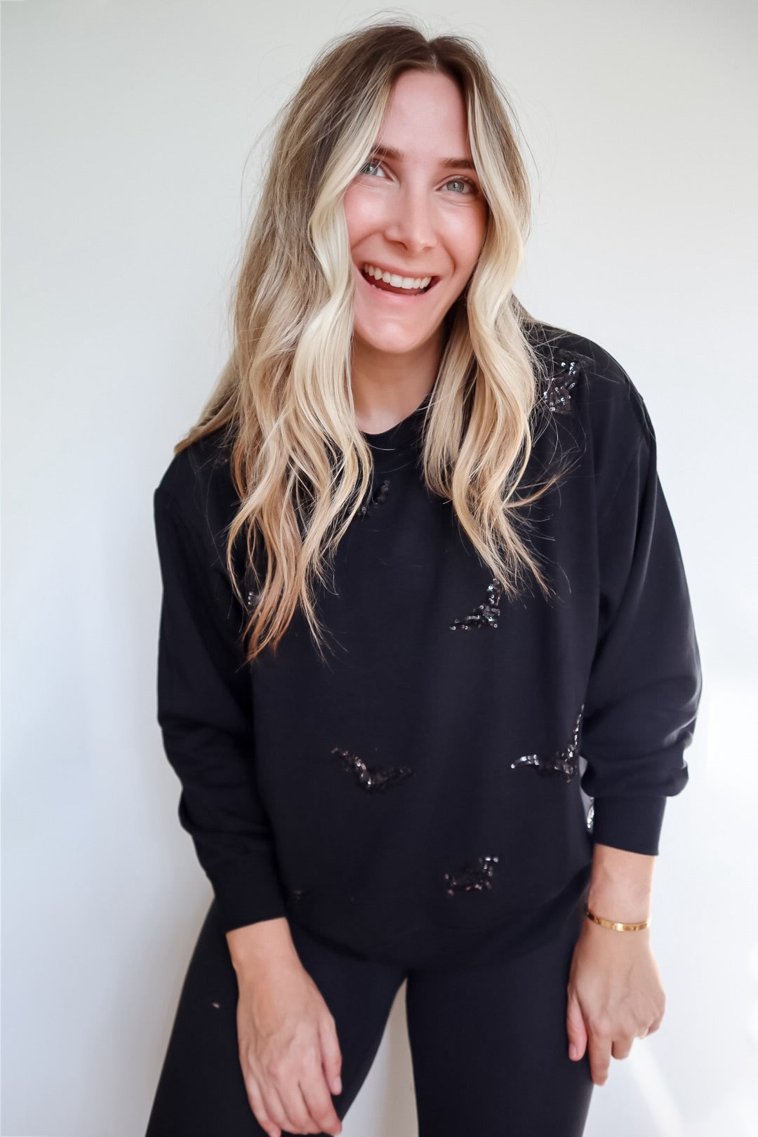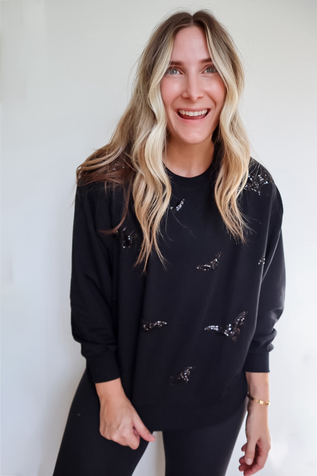 Celebrate Halloween in style with the Mary Square Sarah Sequin Bats Sweatshirt. Crafted from soft, high-quality fabric, it ensures all-day comfort while featuring shimmering sequin bat designs for a festive touch. Perfect for those seeking a cozy yet eye-catching piece this spooky season.