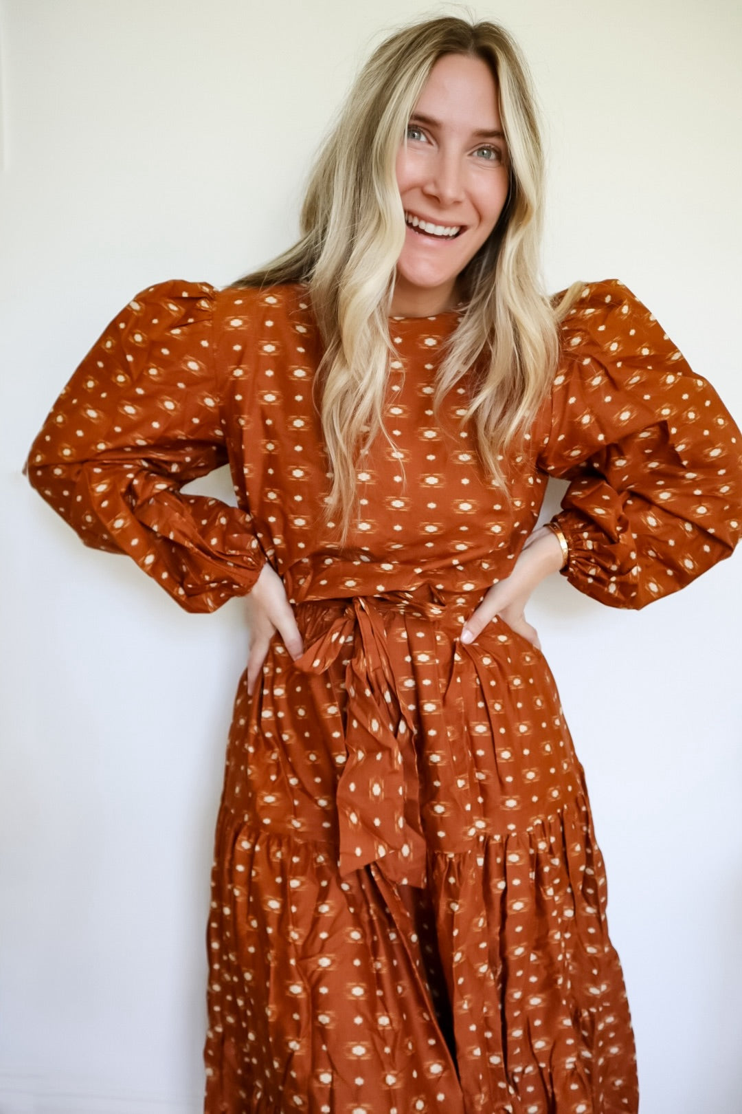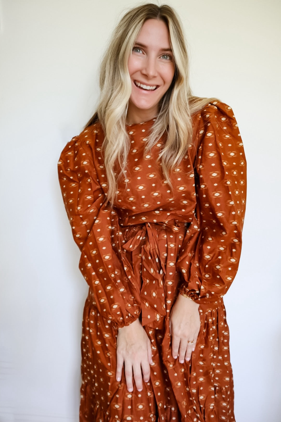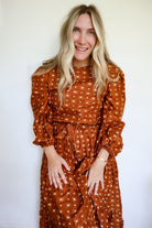 Enhance your wardrobe with the Rebecca Tiered Puff Sleeve Midi Dress. Made from a lightweight, breathable woven fabric, this dress features a stylish round neckline, flattering elasticized waist with self sash tie, and eye-catching tiered skirt. The back button closure adds a touch of elegance to this versatile and comfortable dress.