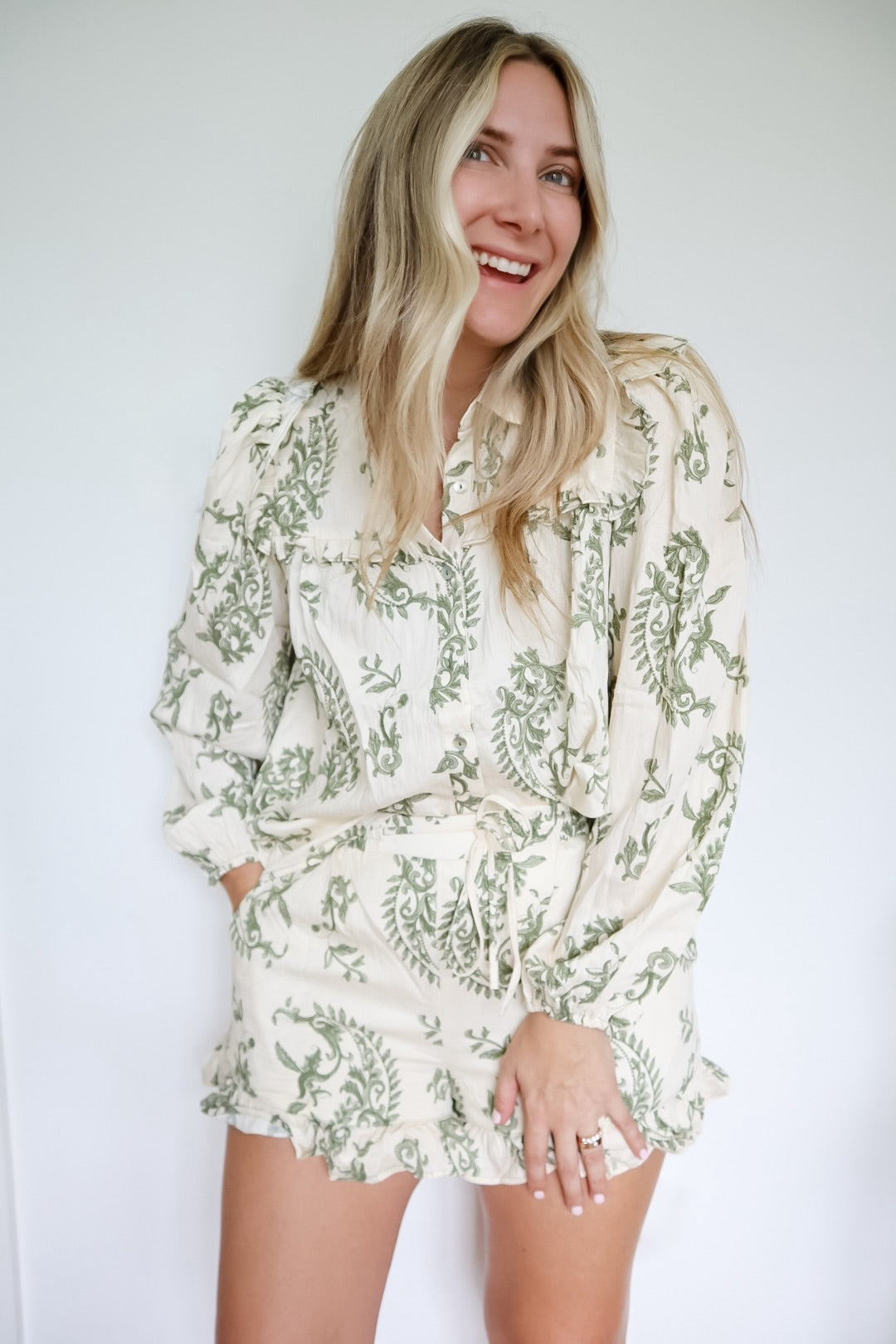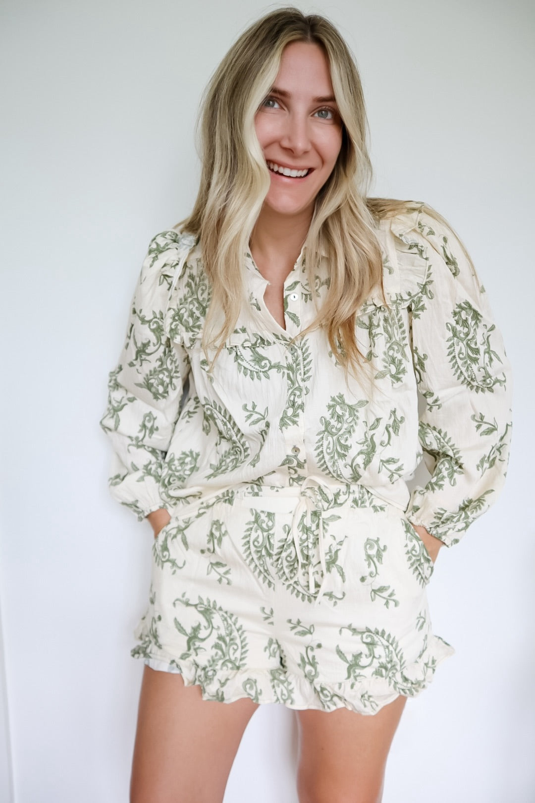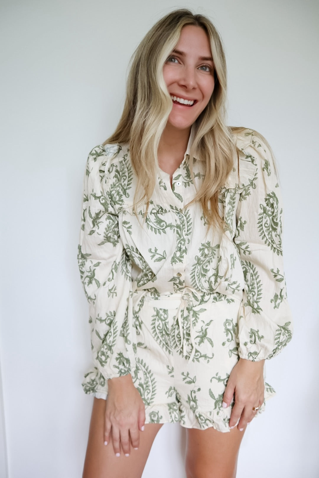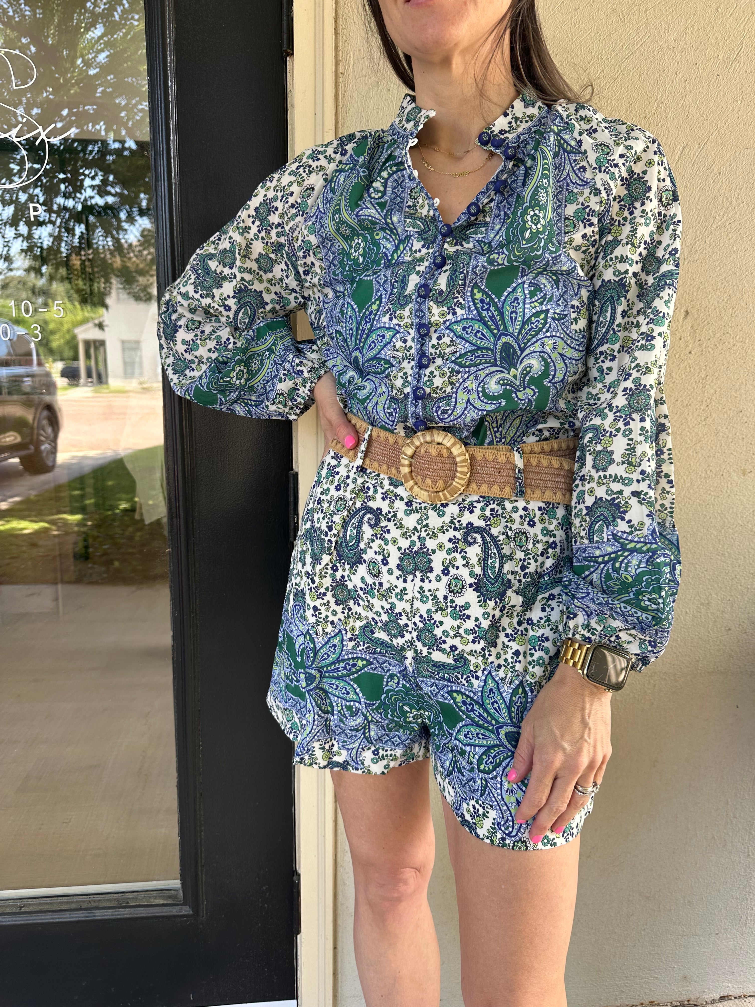 Stacy Printed Long Sleeve and Shorts Set with Belt
