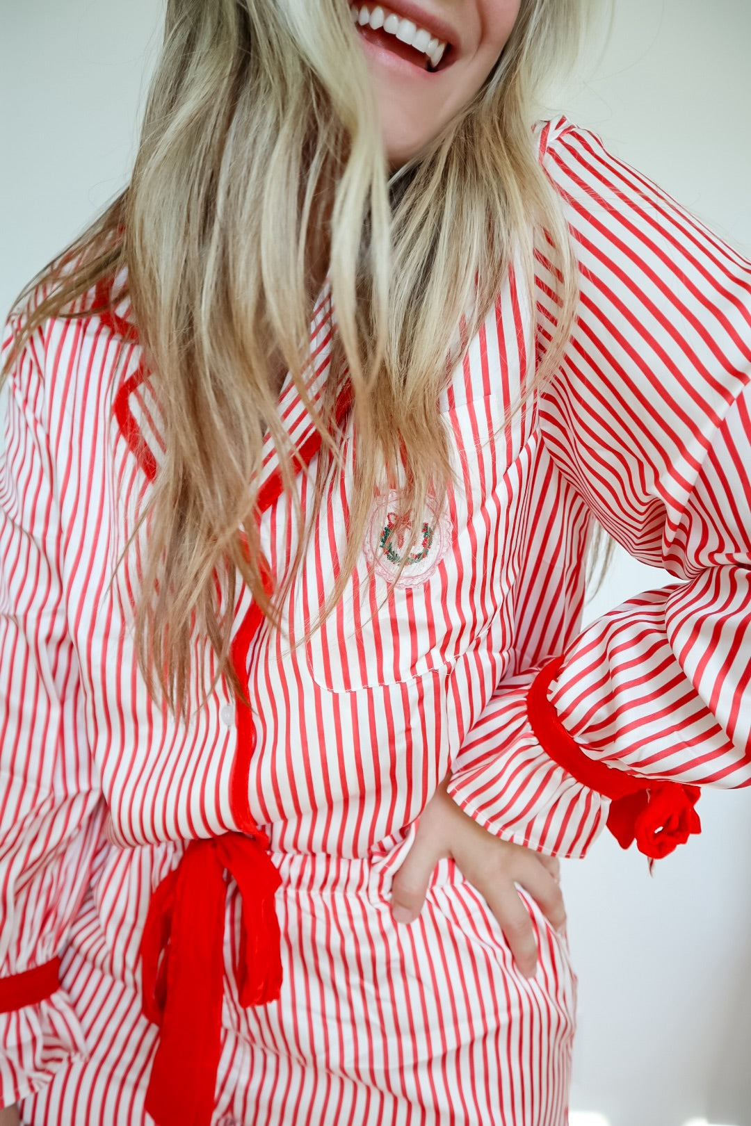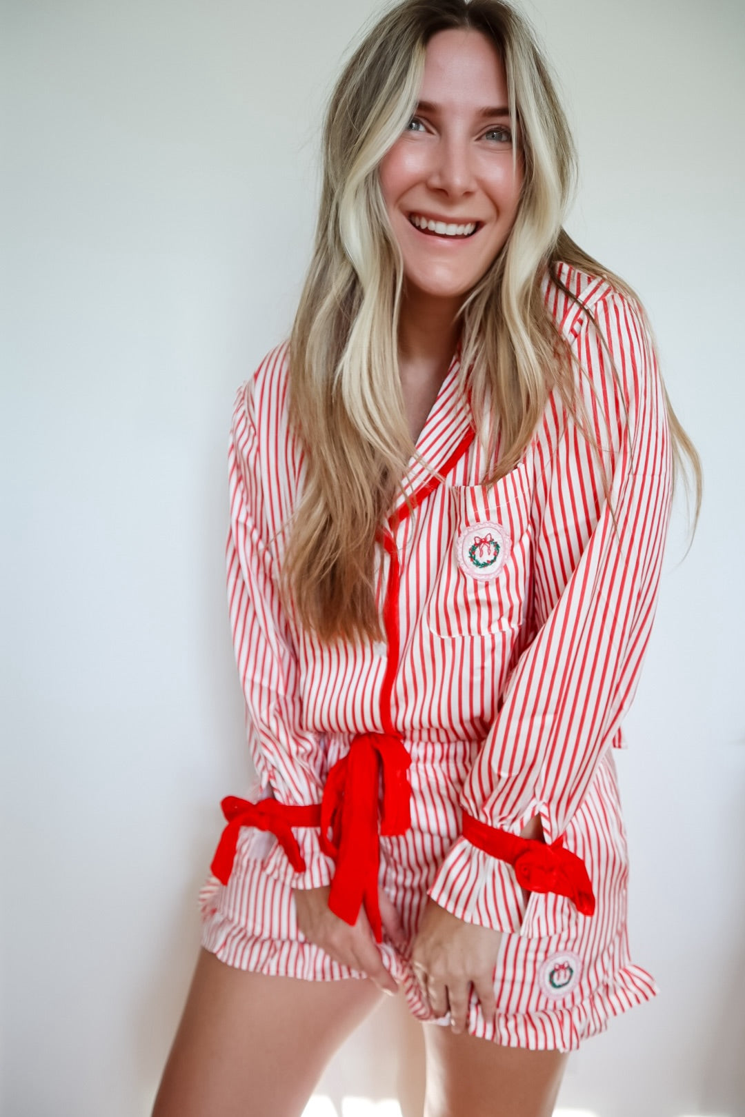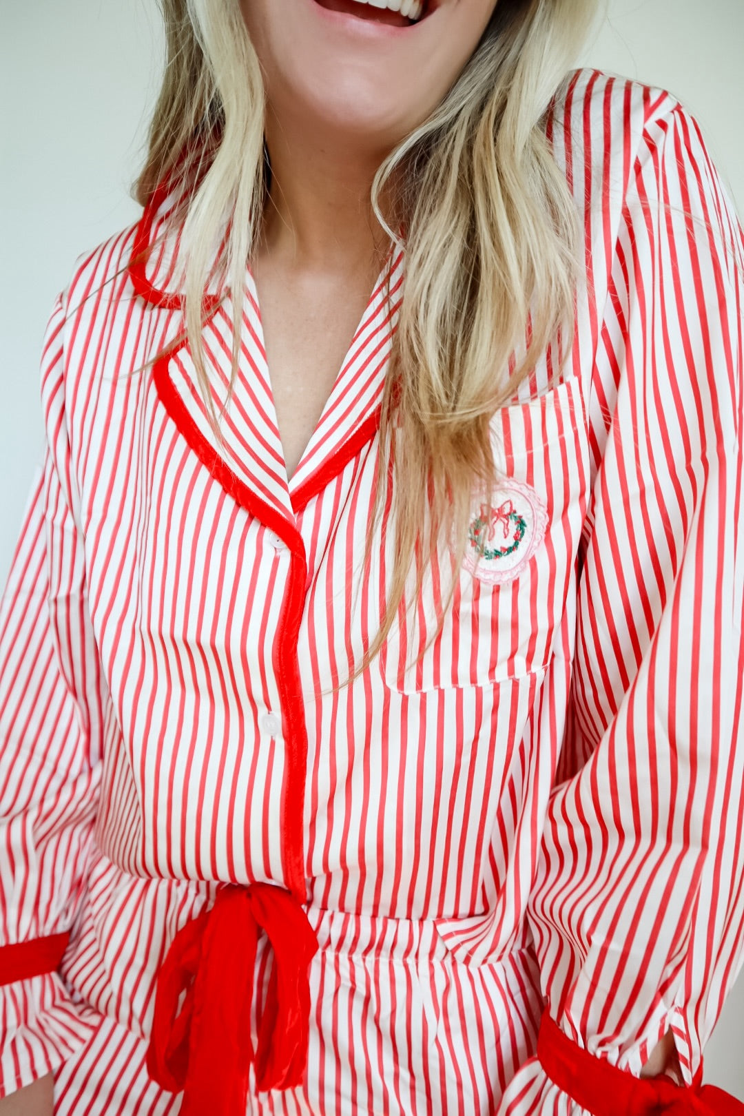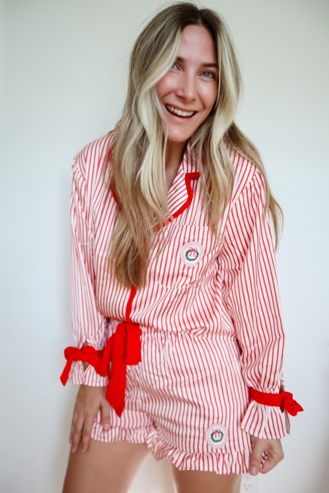 Stay cozy and festive all season long in our Christmas Wreath Embroidered Stripe Pajama Set. Made with comfortable material, these cute pajamas are perfect for lounging or sleeping. The festive design adds a touch of holiday cheer. Get ready to relax in style!