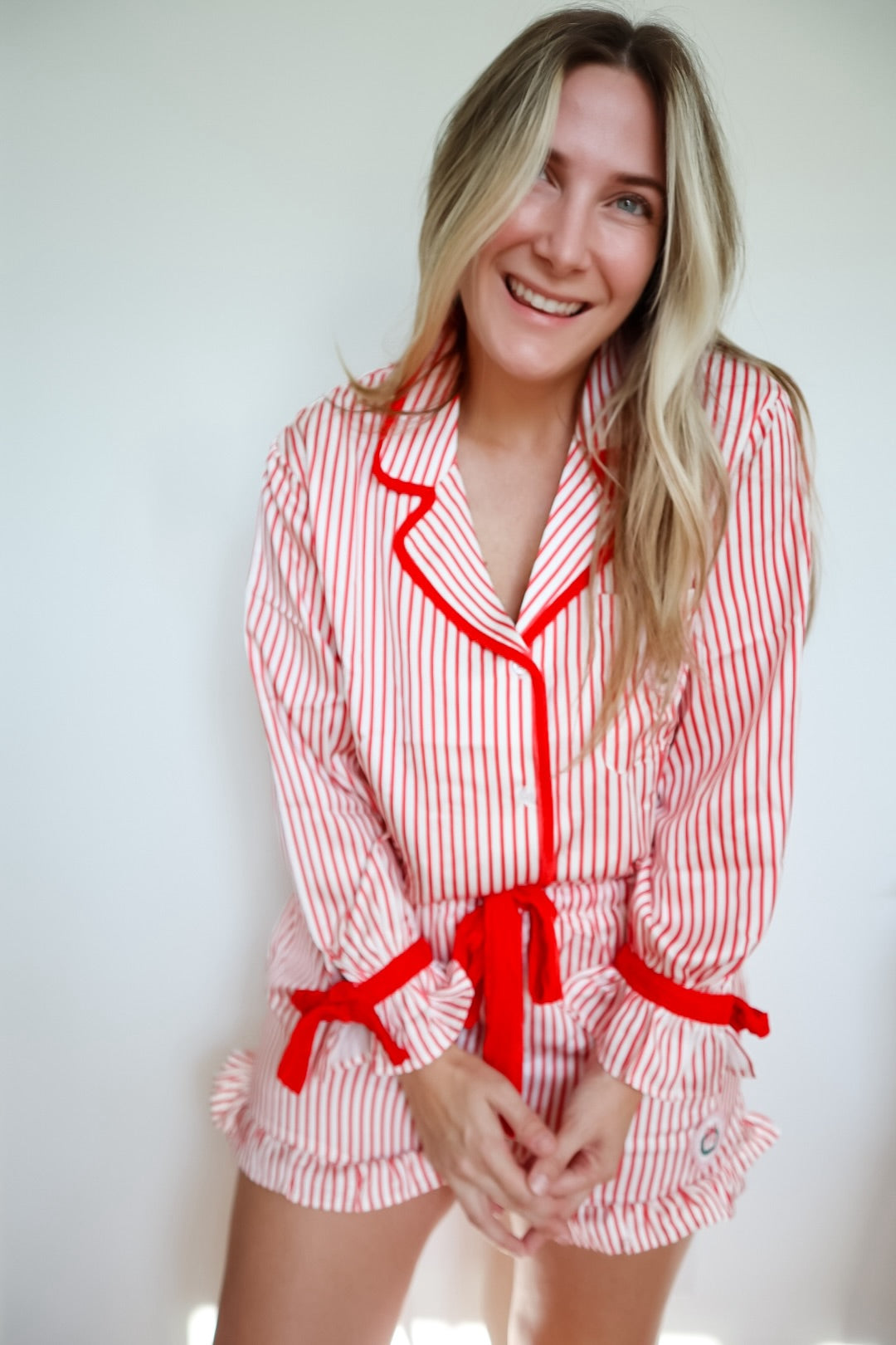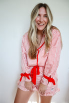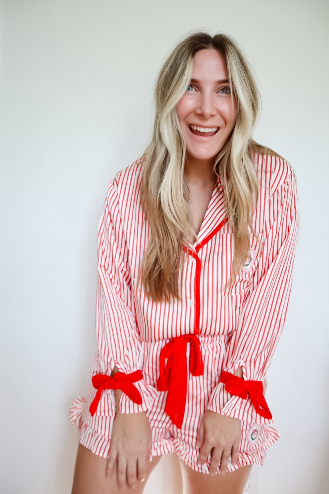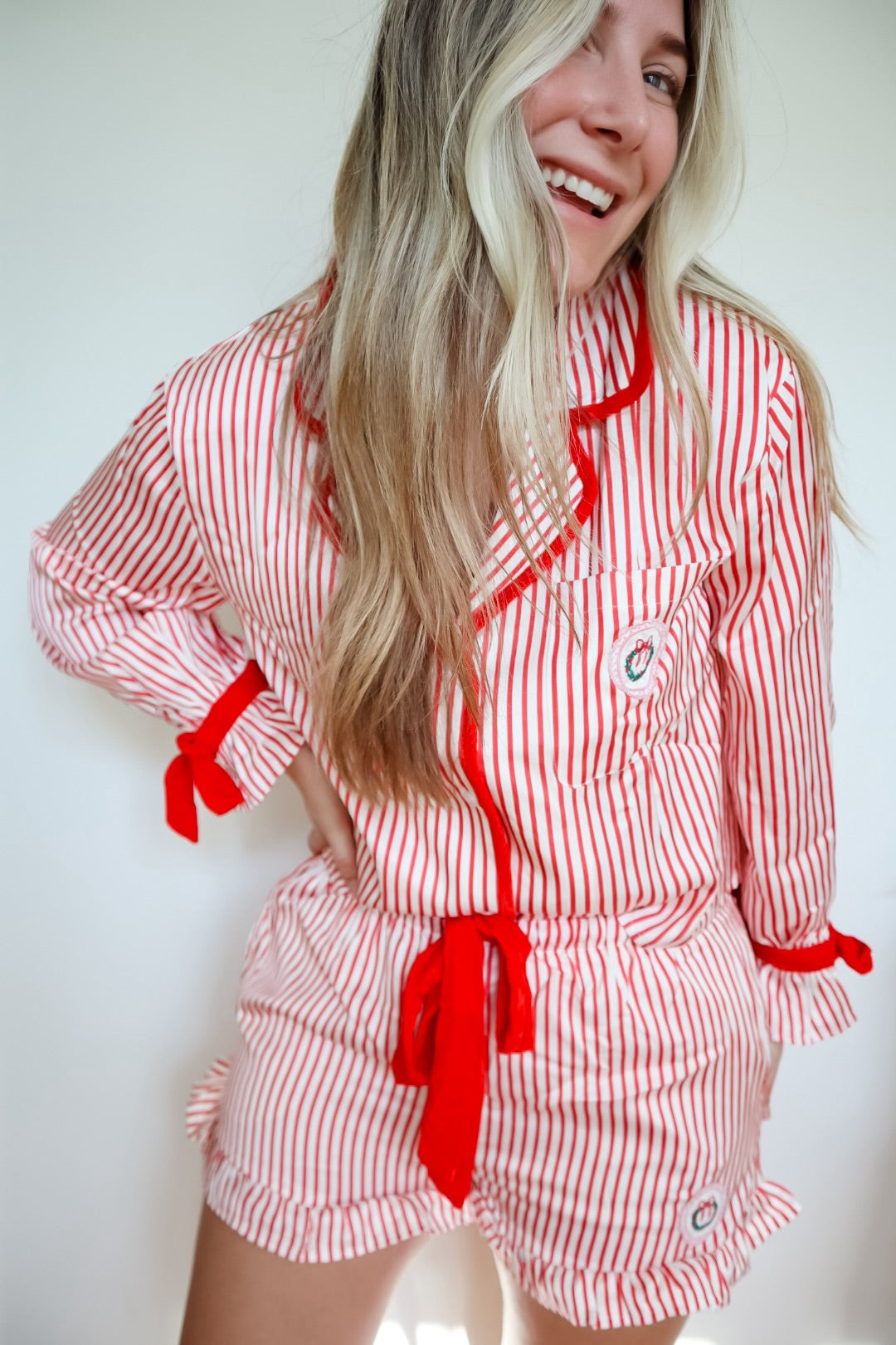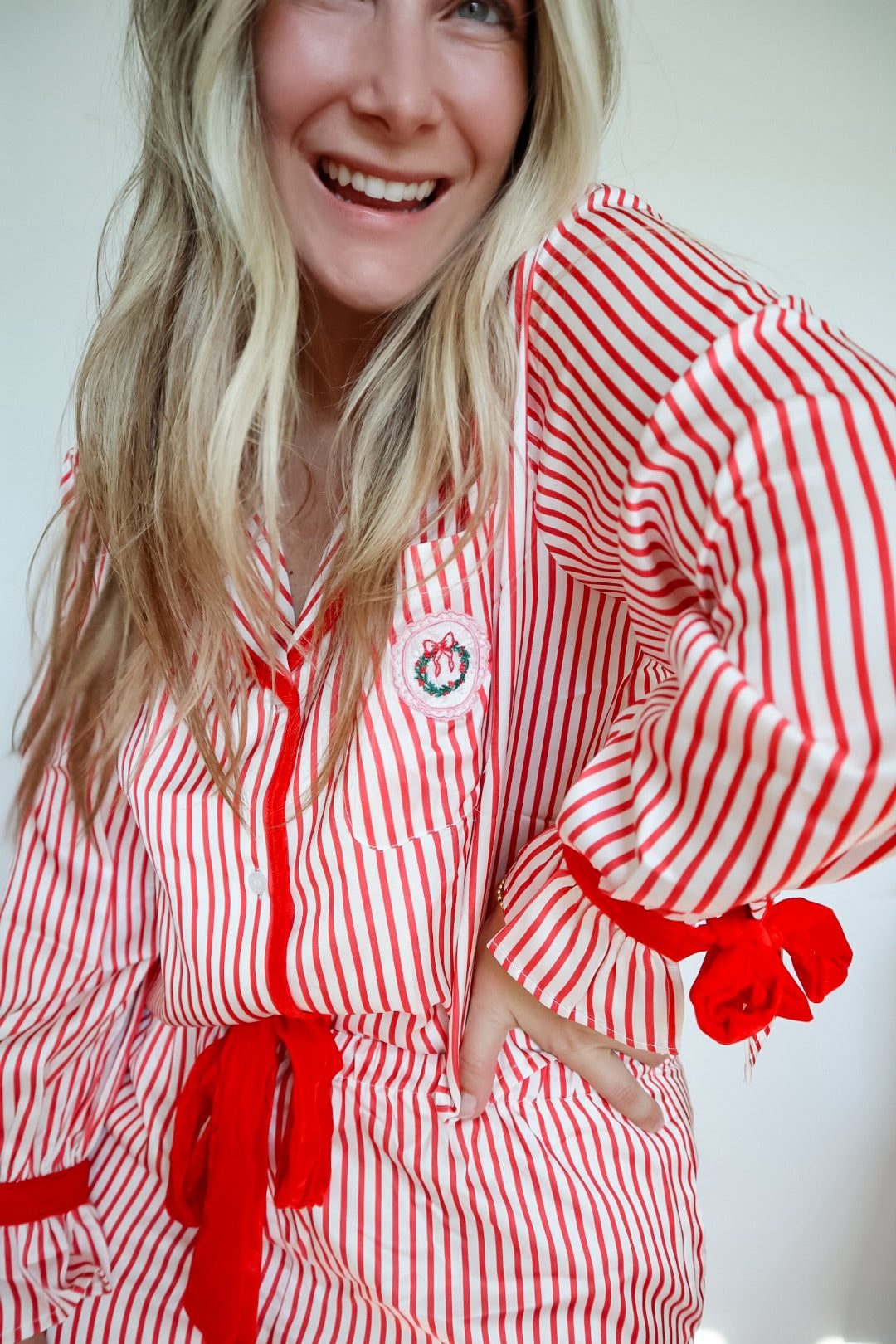 Stay cozy and festive all season long in our Christmas Wreath Embroidered Stripe Pajama Set. Made with comfortable material, these cute pajamas are perfect for lounging or sleeping. The festive design adds a touch of holiday cheer. Get ready to relax in style!