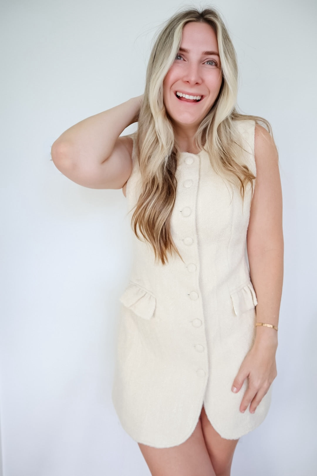 Expertly crafted with quality tweed fabric, the Kimberly Sleeveless Ruffle Pocket Mini Dress offers a charming and flirty look. Its button detailing adds a touch of elegance, making it a must-have for any fashion-forward individual. Perfect for any occasion, this dress is sure to make you stand out.