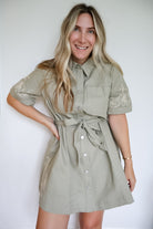 The Megan Floral Embroidery Denim Shirt Dress combines classic denim with delicate floral embroidery for a refined look. Featuring a collared neckline and full button-down placket, it offers easy wear and a tailored fit. Wide short sleeves and front patch pockets add functional style, while the tying sash with belt loops allows for a customizable silhouette. Floral embroidery details on the sleeves and mini hem enhance its sophisticated charm, making it a versatile piece for both casual and polished occasions.