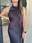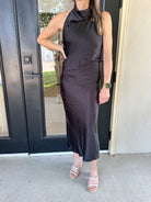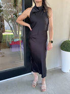 Introducing the Samantha Open Back Cowl Neck Midi Dress, a perfect blend of class, quality, and fashion. The elegant cowl neck and open back design exude sophistication, while the high-quality material ensures a comfortable and stylish fit. Elevate your wardrobe with this must-have dress that is sure to turn heads.