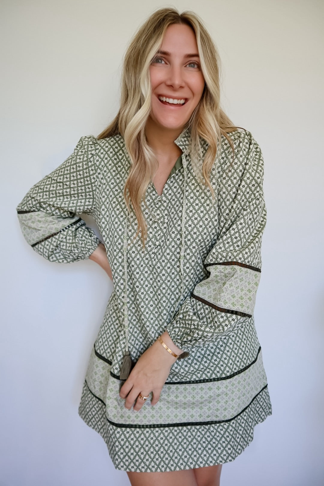 This Stephanie Mixed Print Mini Shift Dress features a versatile mix of prints with a unique stand collar neckline and tying tassel detail. The long puff sleeves with elastic cuffs add a touch of elegance and contrast to the shift silhouette. Plus, it's lined and includes convenient pockets.