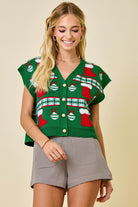 Celebrate the holiday season in style with the Christmas Ornament Motif Knit Vest Top. Featuring festive gold buttons that add a touch of elegance, this knit vest combines warmth and charm, making it a perfect layering piece for seasonal gatherings. Its classic design paired with eye-catching details ensures a sophisticated yet joyful look throughout the festivities.