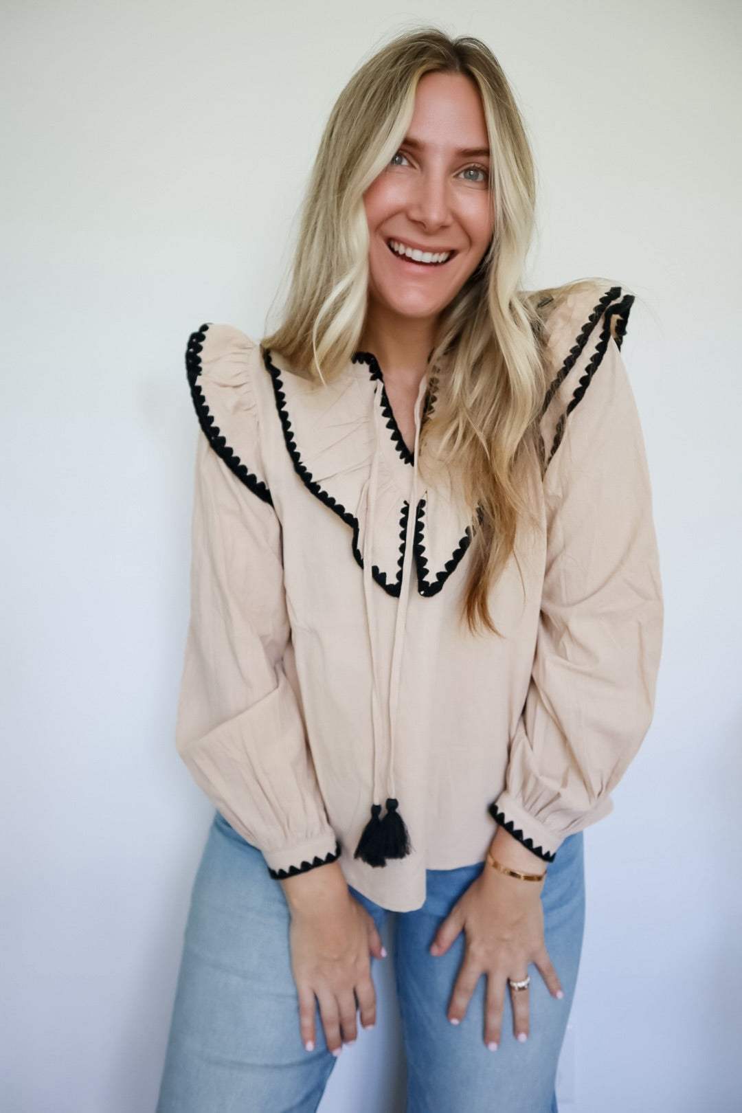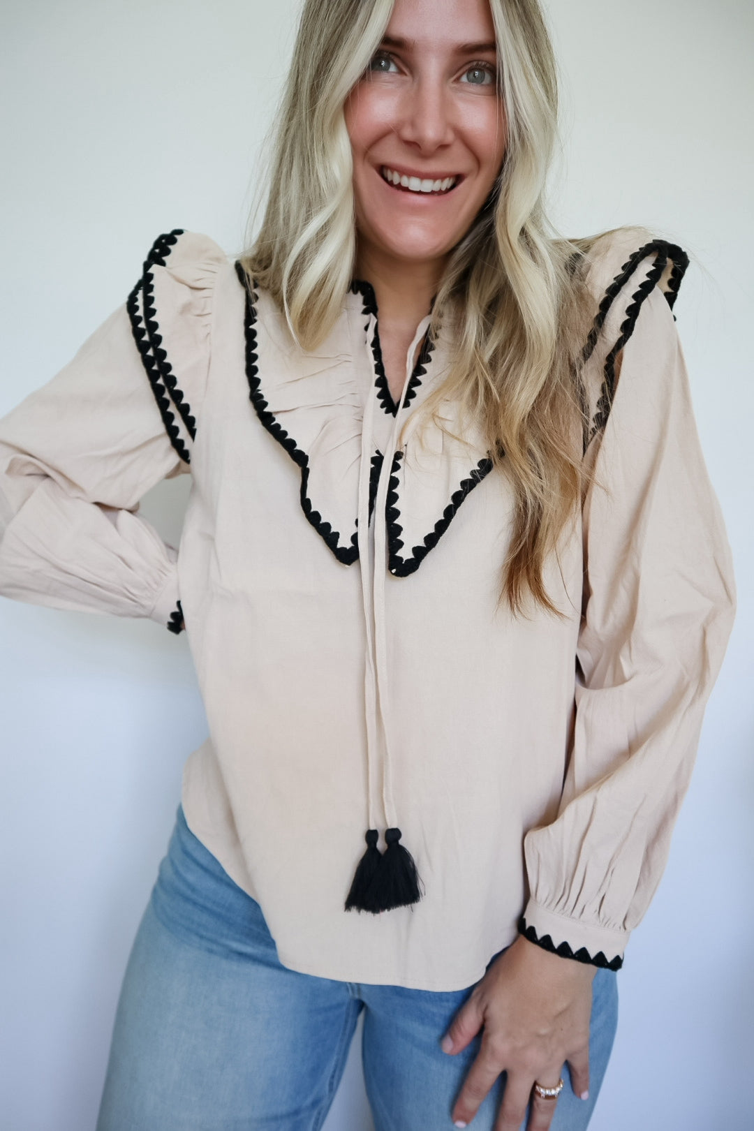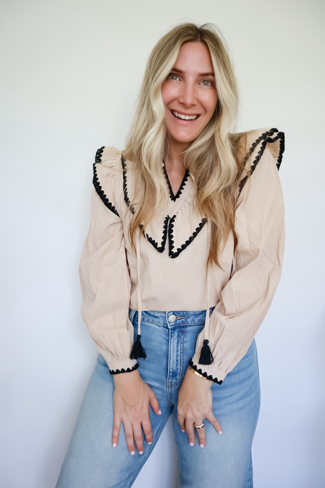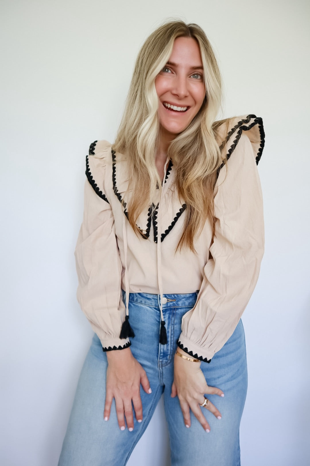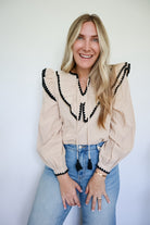 The Jackie Ruffle Sleeve Top with Contrast Stitch is a charming addition to any wardrobe. This top features a contrast blanket triangle stitch on the ruffles, neckline, and cuffs, providing a unique touch to the design. The relaxed silhouette, ruffled V neckline with tie front tassle, and long balloon sleeves with cuffs add a touch of femininity. Perfectly lined for comfort and style.