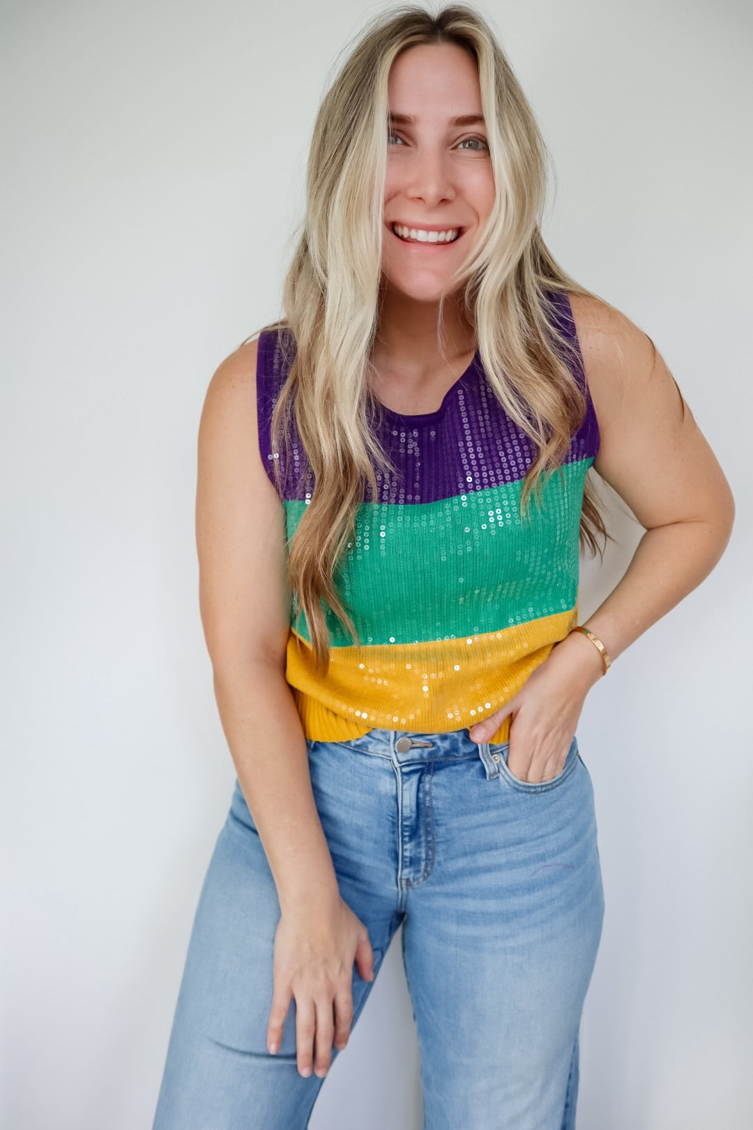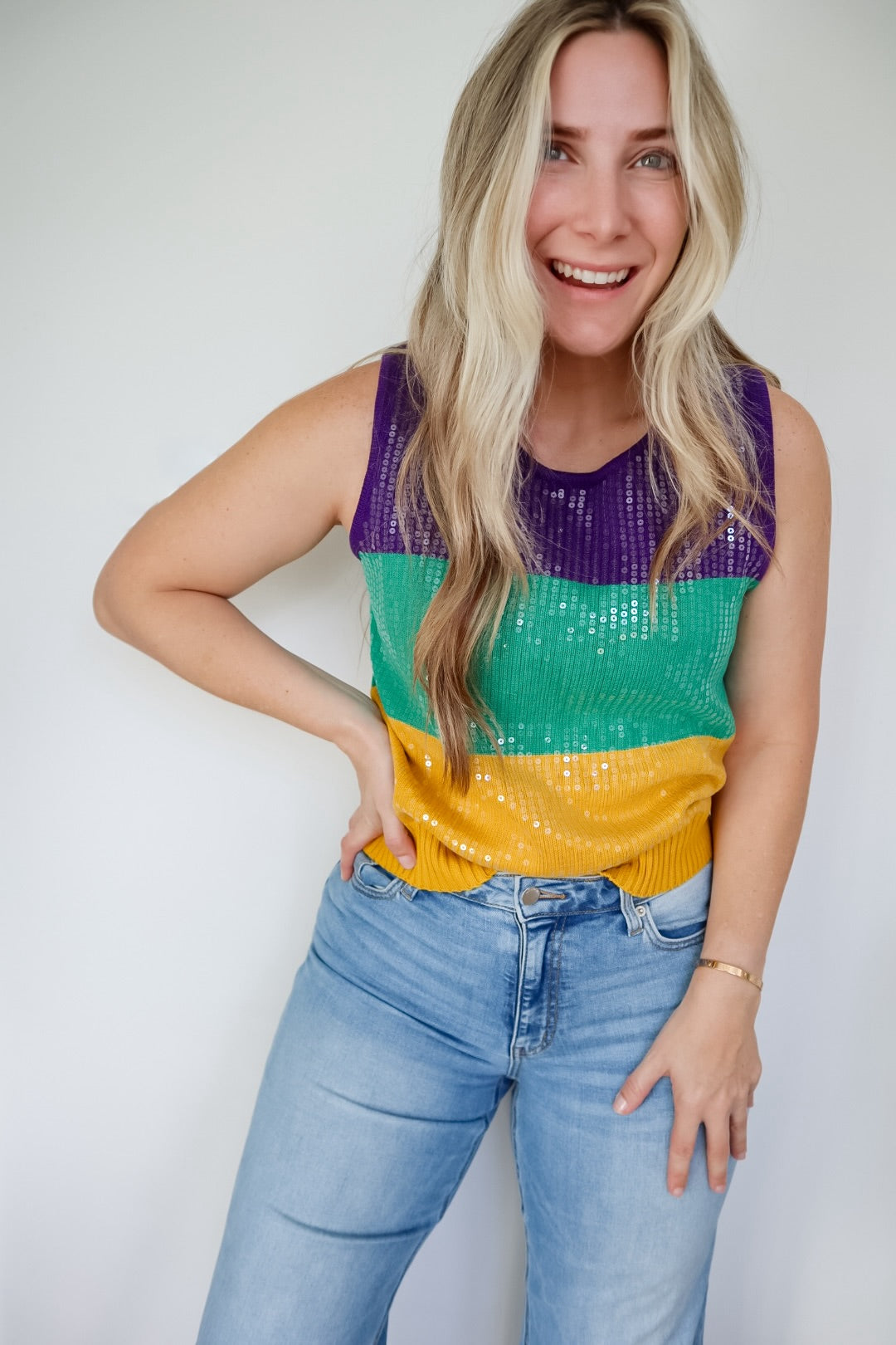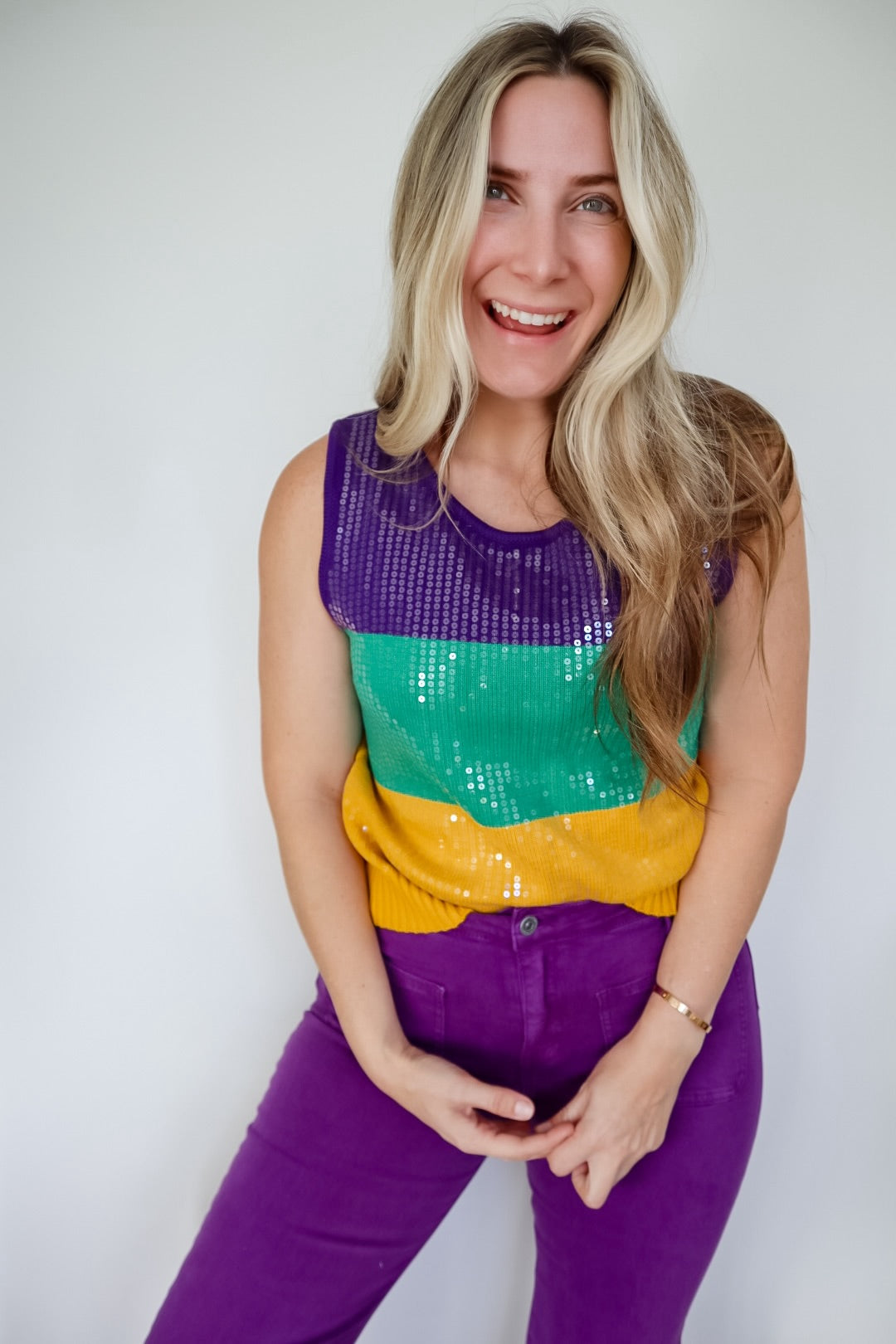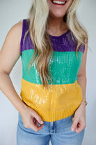 Elevate your style with our Mardi Gras Sequin Color Block Sweater Tank. This sleeveless top offers both fun and comfort while showcasing a cute color block design. Made with quality materials, it's sure to be a staple in your wardrobe. Perfect for any occasion!