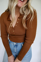 Tamara Collared Gold Snap Button Brown Long Sleeve Knit Top