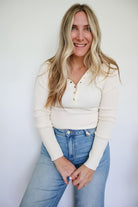 Tamara Collared Gold Snap Button Cream Long Sleeve Knit Top
