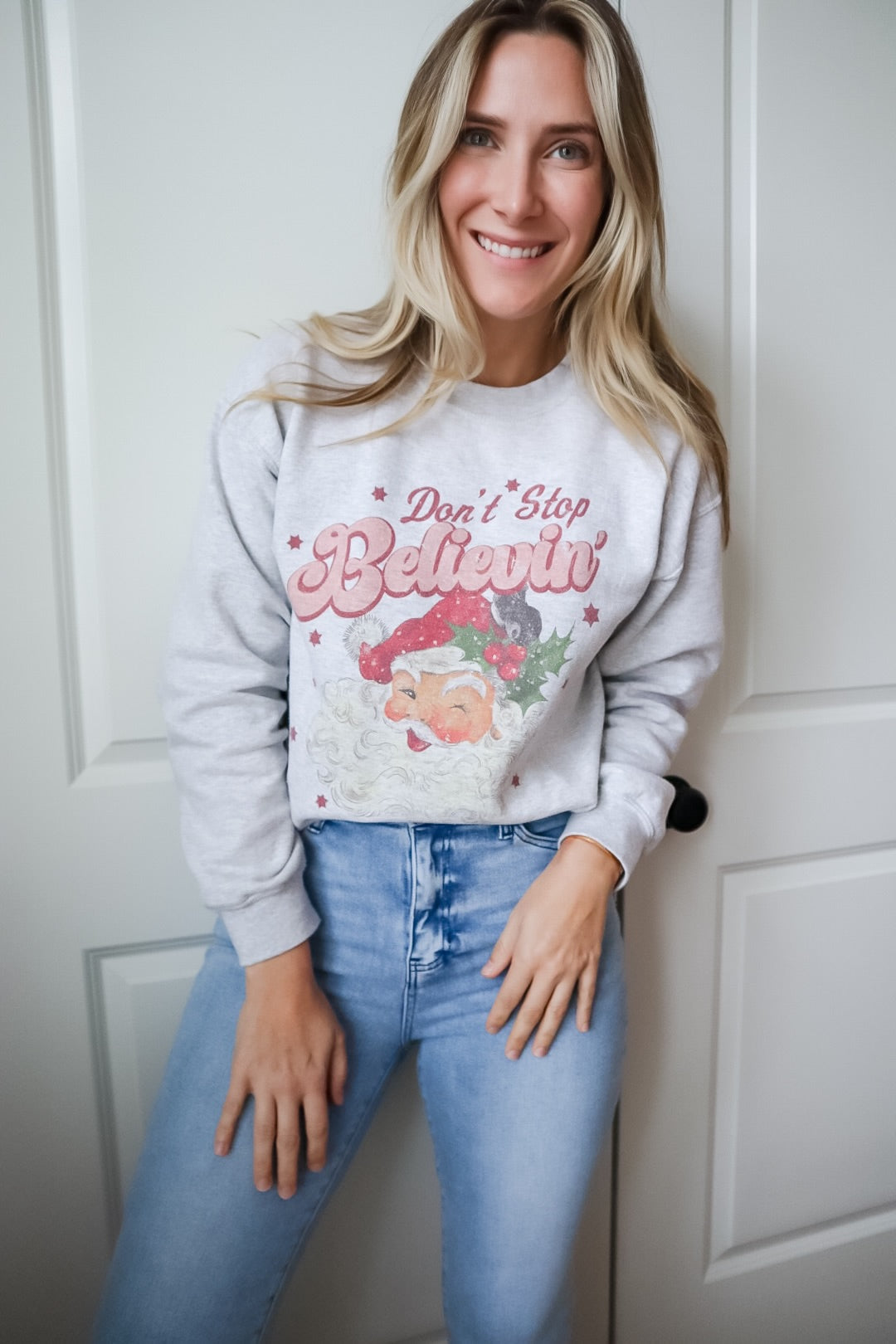 Stay festive and cozy this holiday season with our Don't Stop Believing Santa sweatshirt. Made with comfortable material, it's the perfect addition to your winter wardrobe. Keep the holiday spirit alive with this festive piece.