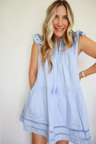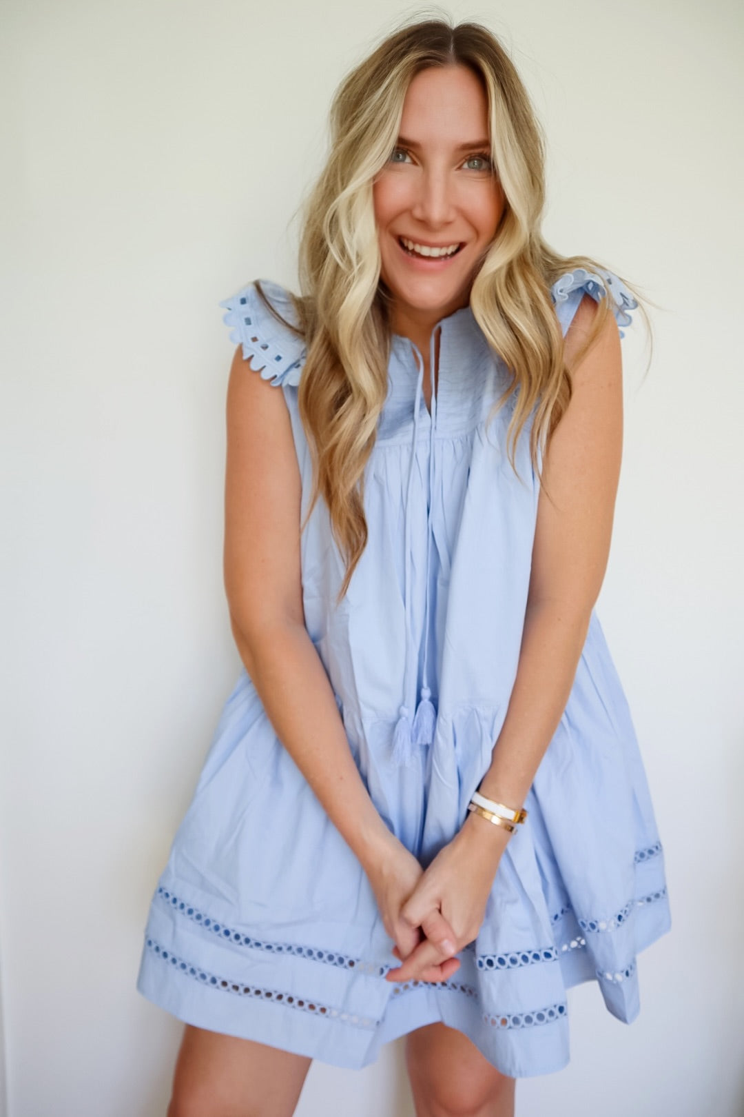 This Grace Eyelet Detail Tassel Mini Dress boasts a charming and feminine design, with delicate eyelet detailing and playful tassel accents. Its pretty and sweet aesthetic elevates your fashion game, making it a must-have for any stylish wardrobe.