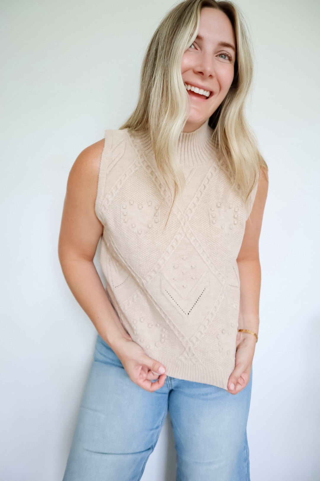 The Julia Cable Knit High Neck Sleeveless Sweater is a must-have addition to your wardrobe. Featuring a cute and fashion-forward design, this sweater is both stylish and versatile. Made of soft materials, it offers both comfort and style in one. Elevate your look with this sophisticated and trendy piece.