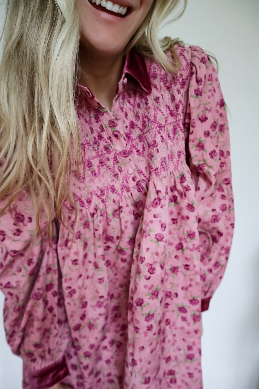 Sandra Smocked Floral Print Cordoroy Dress